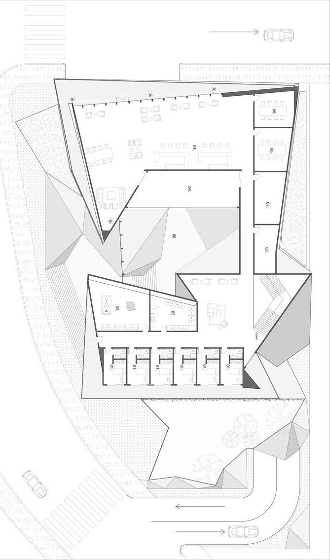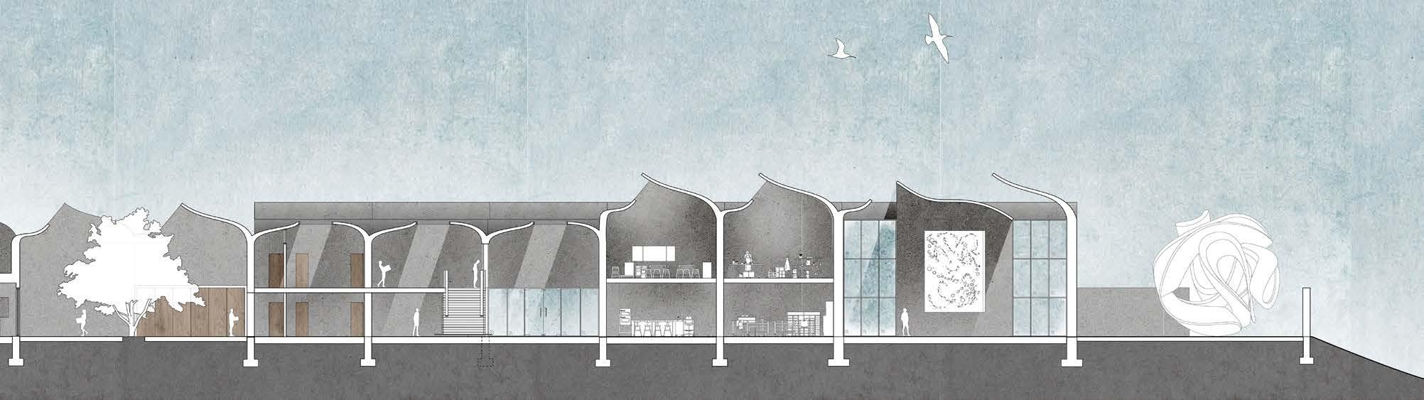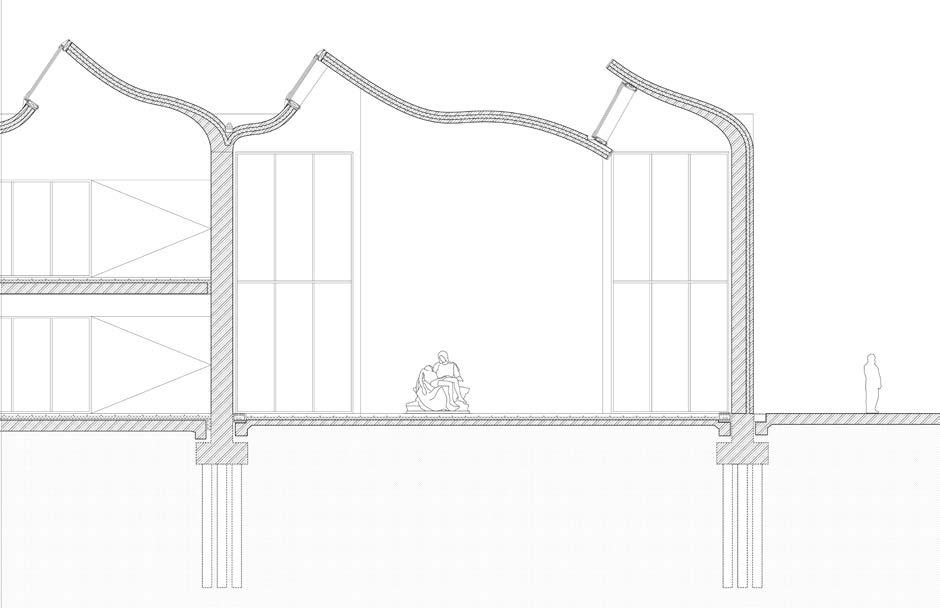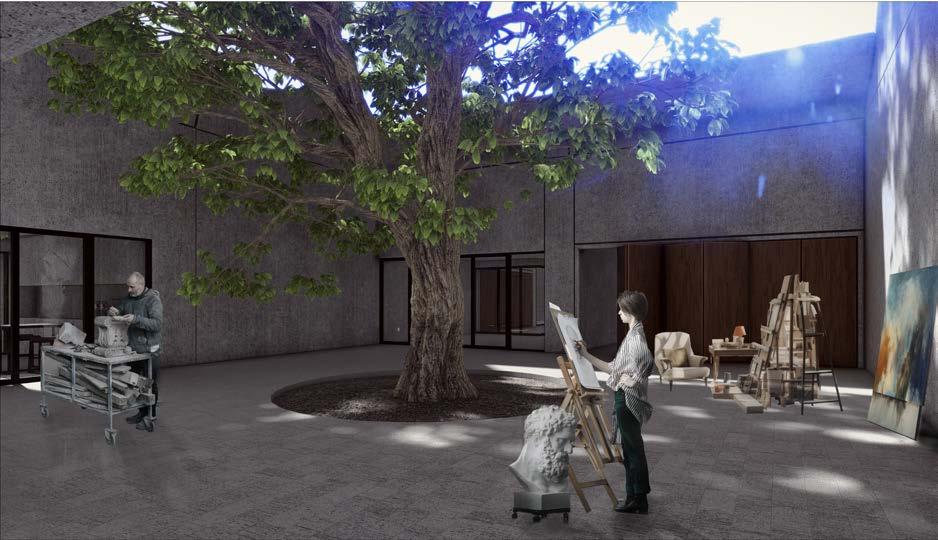 The rooftop shape corresponds to the function of each chamber, whether workshop, studio, or residency. It also adapts to the need for natural light, providing unique lighting conditions for artists, whether they are sculptors or painters.