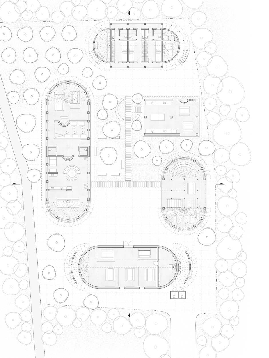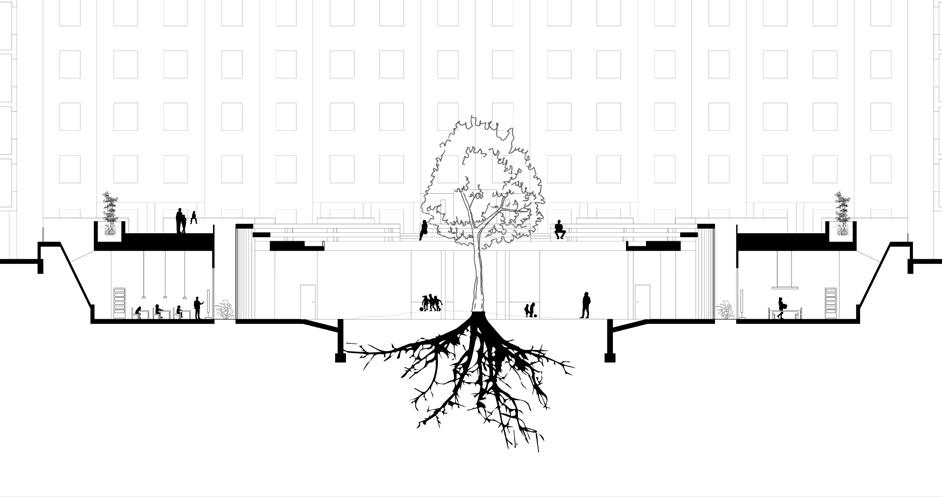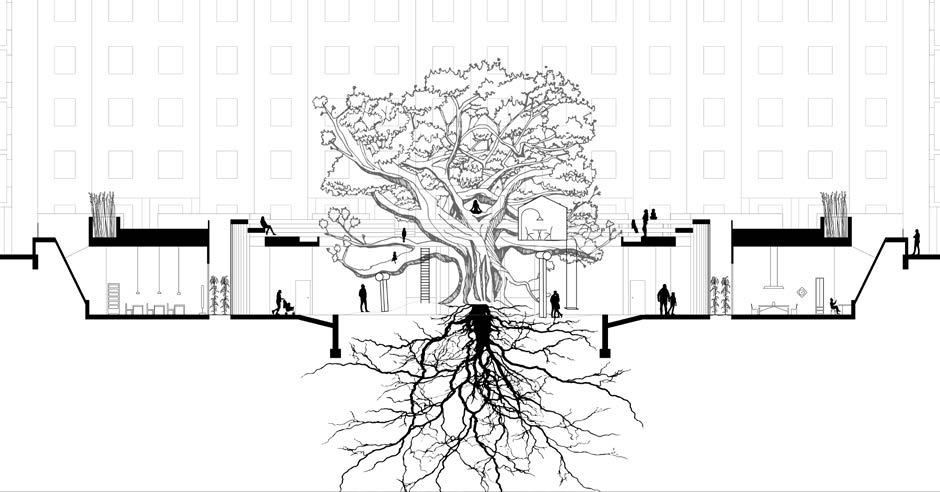 The park, with shared common spaces such as offices, classrooms, and stores located at the lower level, is designed as a representation of nature's utilization, influencing the behavior and perception of its inhabitants. By integrating the tree's growth timeline from sapling to grand tree with human interaction, the project creates a dynamic space where nature and urban life coexist and influence each other.