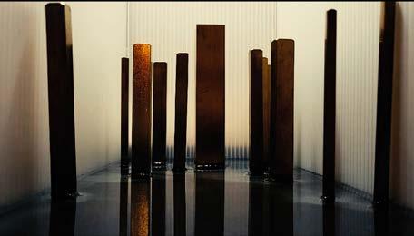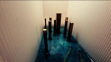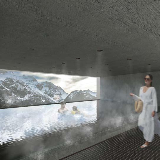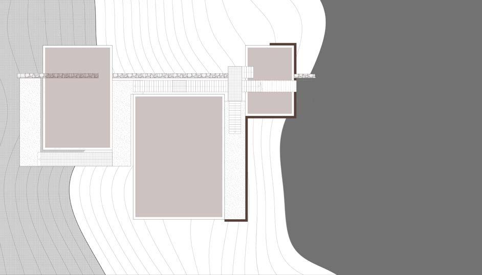 The space is divided into two levels. The upper floor, a large rectangular structure, is embedded into the mountain, with corten steel panels contrasting rough concrete walls and perforated metal floors. The lower floor features three staggered outdoor pools, creating a water-walking experience. Gabion walls built with local rocks enclose the space, allowing natural weathering and blending the design with its environment over time.