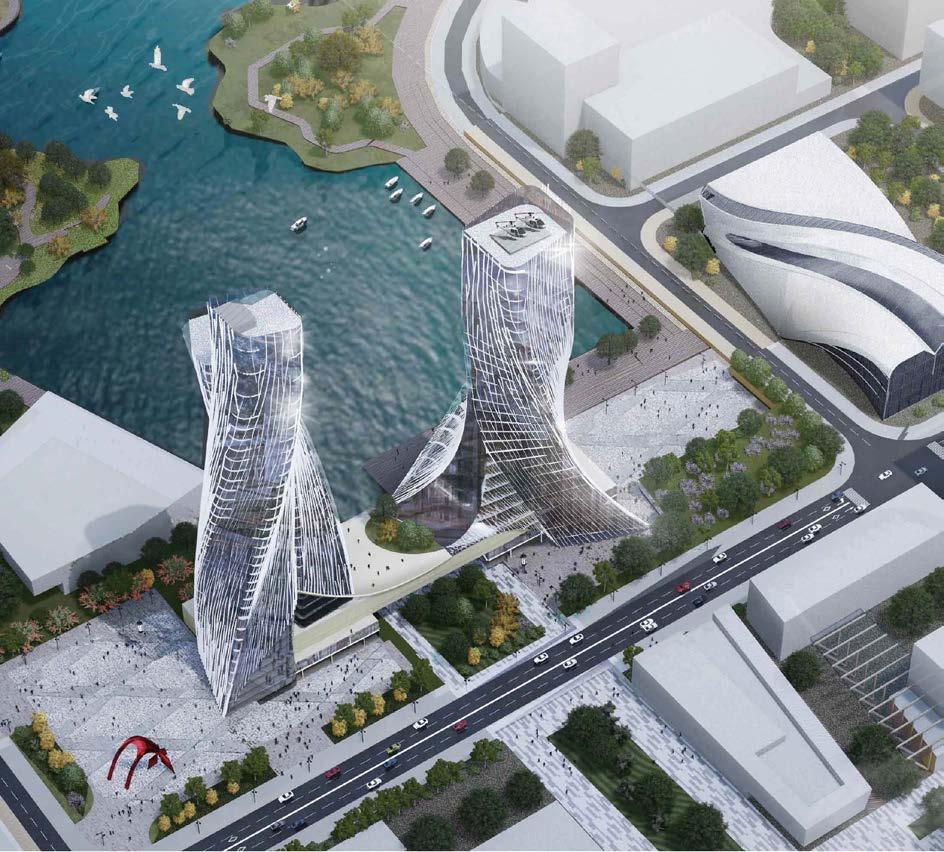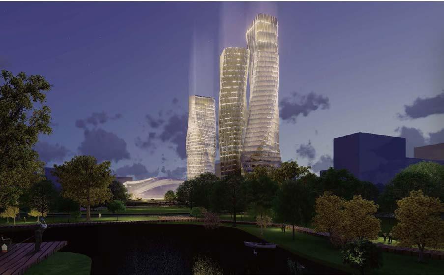 The Quzhou Central City Complex, with its distinctive double helix-shaped main tower, symbolizes the fusion of scientific innovation and ecological sensitivity. Inspired by DNA, it integrates ecological bridges, promoting connectivity and sustainability.