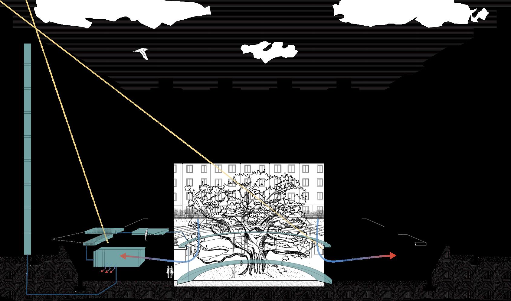 A system reuses gray water gathered from the surrounding residences, using plants like common reed and cattail planted around the park to purify the water resources for both the tree and the people. The water tank, designed with eight thick walls, not only stores water but also functions as thermal mass, storing heat to cool down the entire building. The integration of nature with the urban environment is not only an expression of architectural form but also a realization of sustainable functions.