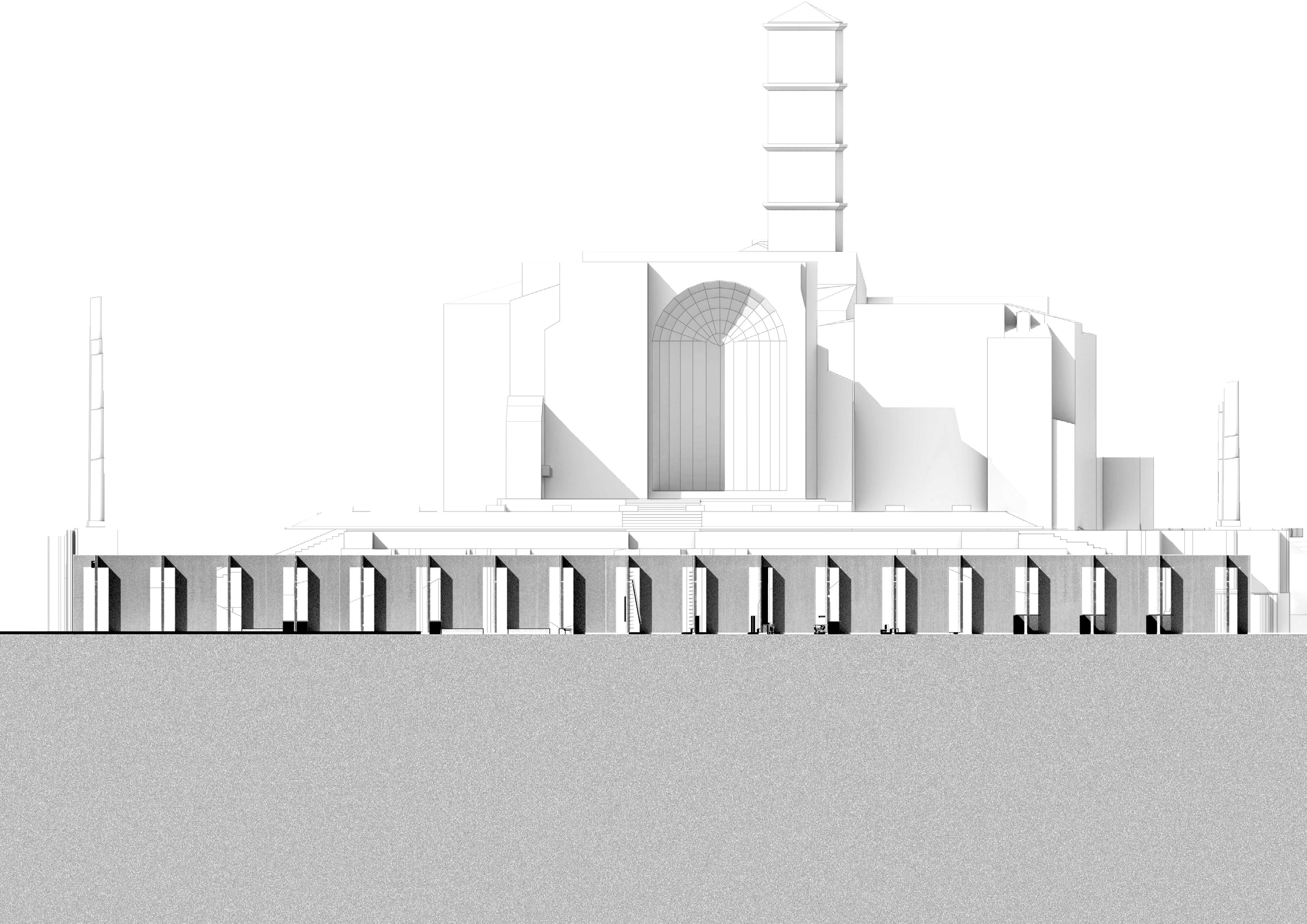 A grid system, inherited from the temple of Venus and Rome, is applied. It extends visual element from the temple, and multiplies the grid element.