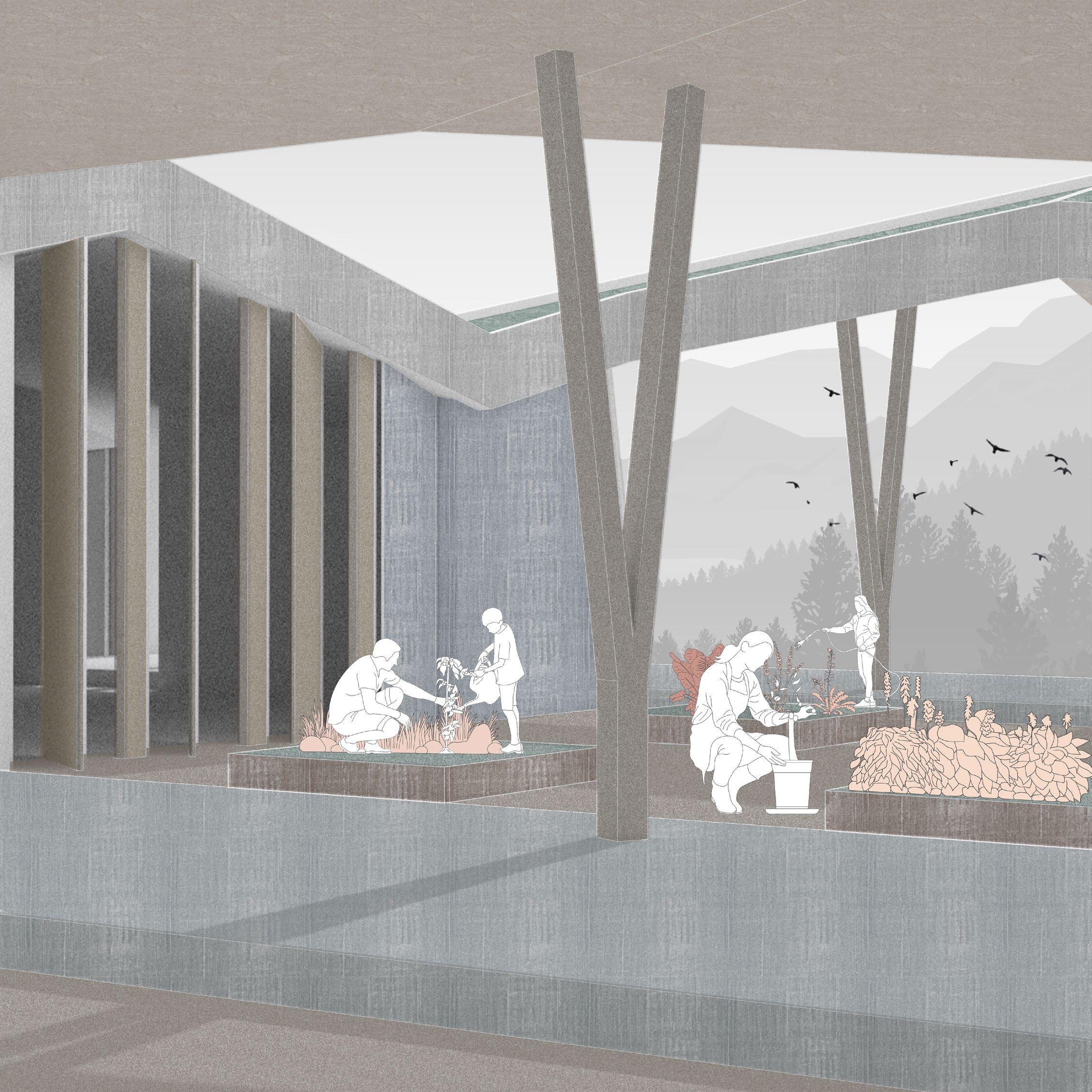 The roof, a key design aligns with the site’s natural contours and facilitating rainwater collection for irrigation. The roof includes birdwatching spots, a staffonly breeding area for endangered species, and small community gardens, emphasizing sunlight exposure.