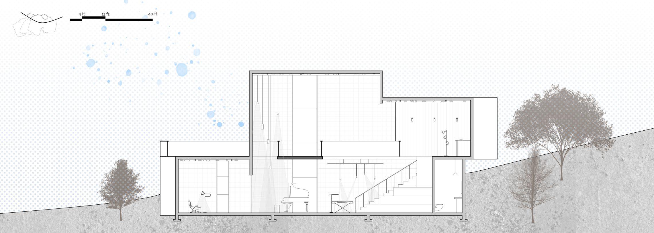 My ambition extends beyond chair design; I envision crafting a house that serves as a gallery for my classmates’ chair creations. This contemplation led me to ponder the essential “point” of chairs: the act of sitting. Consequently, I have conceived a house not merely for chairs but for the experience of SITTING. Chairs are purposefully positioned before narrow windows that frame and accentuate selected vistas. To sit in one of these chairs is to immerse oneself in the extraordinary views that the site offers.