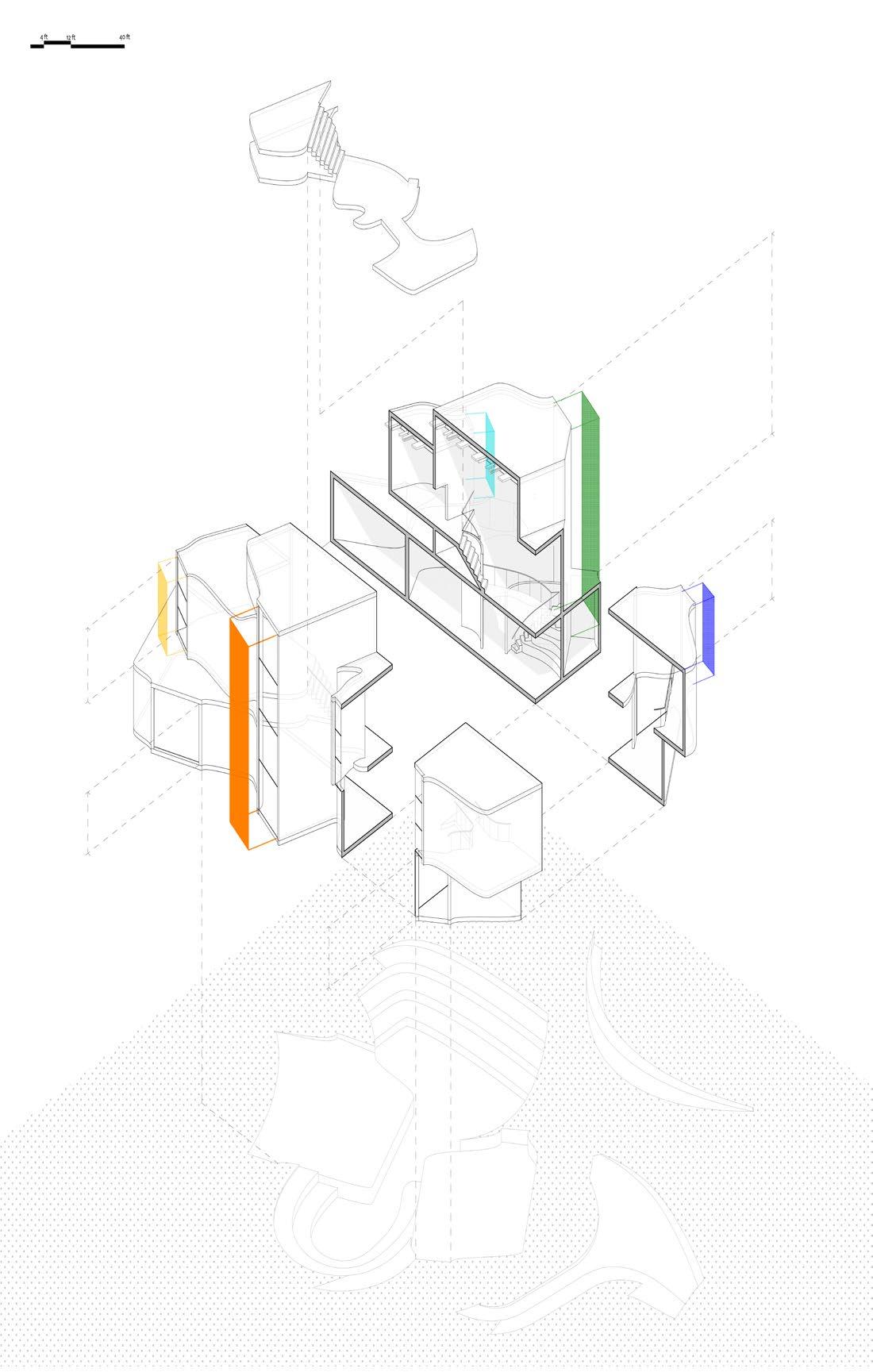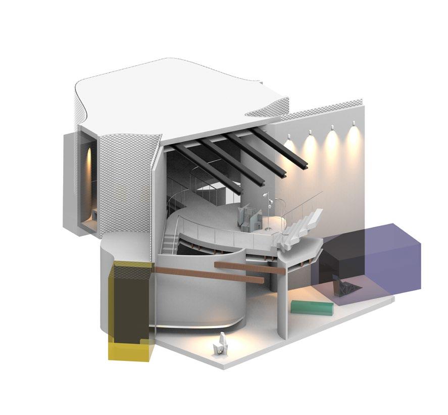 While people are free to explore the space, a navigation system is designed. It is made of three elements: water, light, and color. Water divides quiet space, office and library, from commercial area. skylights mark exhibition space.