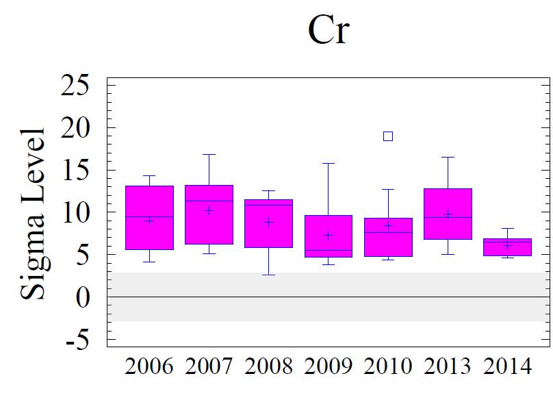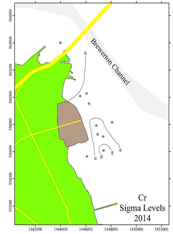 7. The spatial pattern of the metals concentrations, expressed as sigma level contours, for all elevated metals (Cr, Cu, Pb and Zn) depicts the entire area of sediments adjoining the Cox Creek DCMF as significantly enriched in these metals. The local sigma maximum was observed at sampling station #8 during the 2014 event, located to the southeast of the DMCF, consistent with most preceding monitoring years. Over time (2006-2014), there has been no observable increase in size of the area with metals enrichment nor has there been any upward trend in the magnitude of metals enrichment (as expressed in sigma levels) in the sediments adjacent to the facility. We interpret the stability of spatial pattern, size and magnitude as indicative of no outward effects from the Cox Creek DMCF operations to the exterior sedimentary environment.