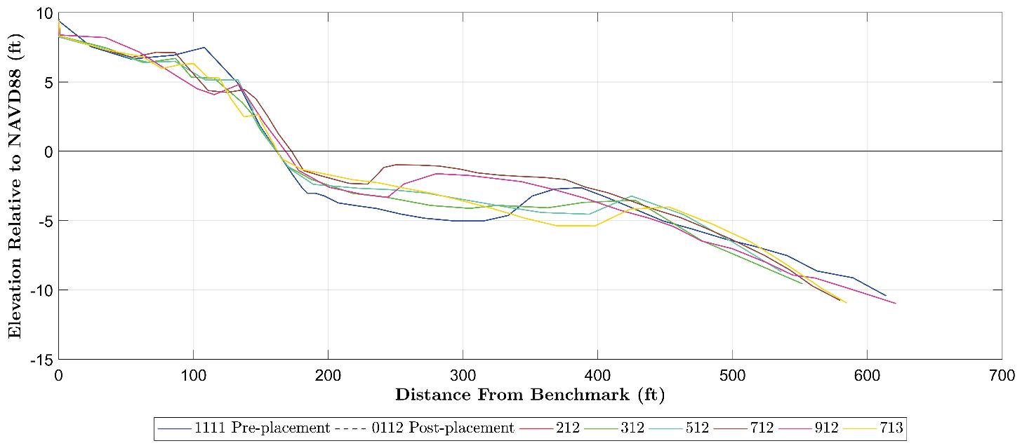 Figure 9. Example profile (R52) in the control area west of the berm at Perdido Key, Florida (based on data from Brutsché et al. 2015). Dates are given in MMYY format.