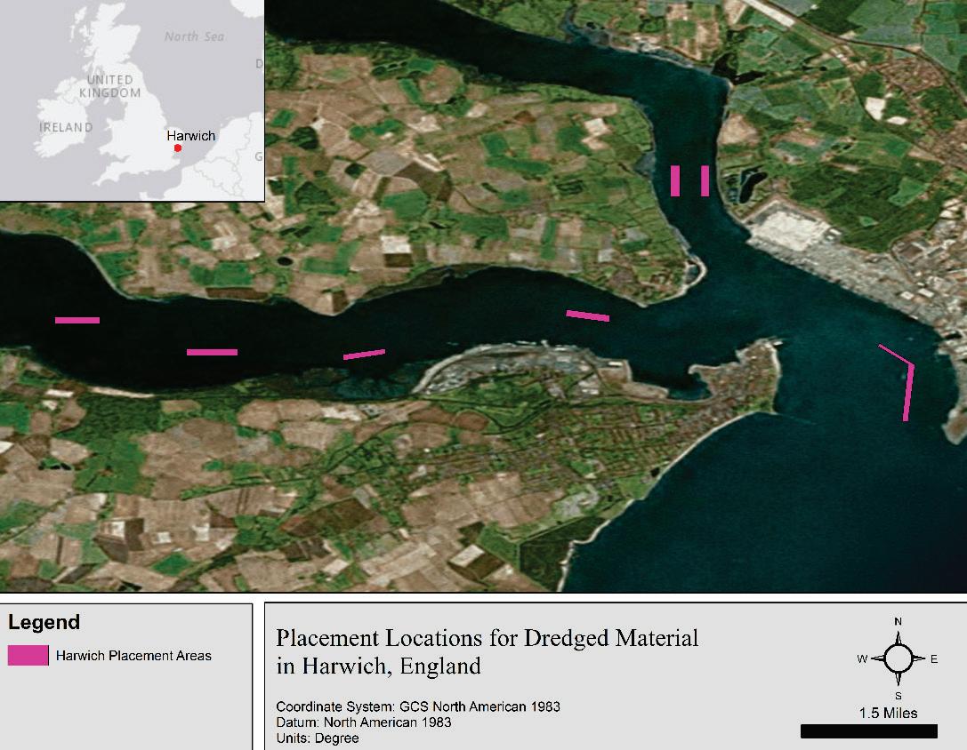 Figure 23. Subtidal placement locations for dredged sediment at Harwich Haven, England (data from Simpson et al. 2005), selected as part of the sediment