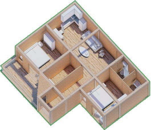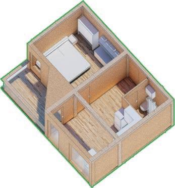 Bathroom 2m*2m Kitchen & dinning room 2m*4m or 4m*4m Bedroom 2m*4m or 4m*4m Living room 2m*2m 2m*4m 4m*4m Bedroom Living room Kitchen & dinning room Bathroom Corridor Outside CLT slabs R value= 9 Timber penal wall R value= 6.25 Double glazed windows U value= 1.1 LVL frame