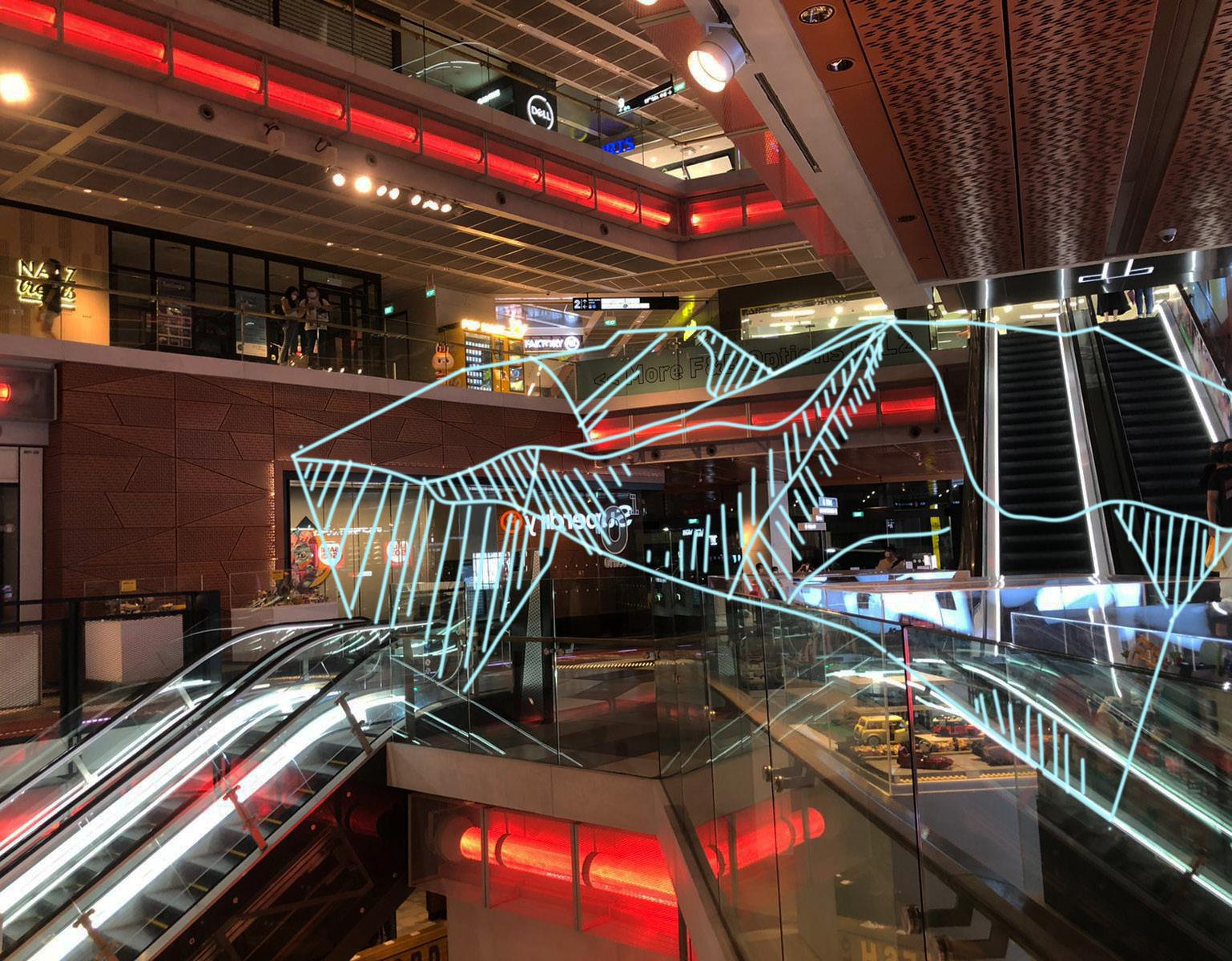 chose this specific location is because it is near the entrance and there is high circulation of people, especially near the 2 escalators. the intentions are to get allow people to pass by The Cosmos and hopefully be intrigued by the space.