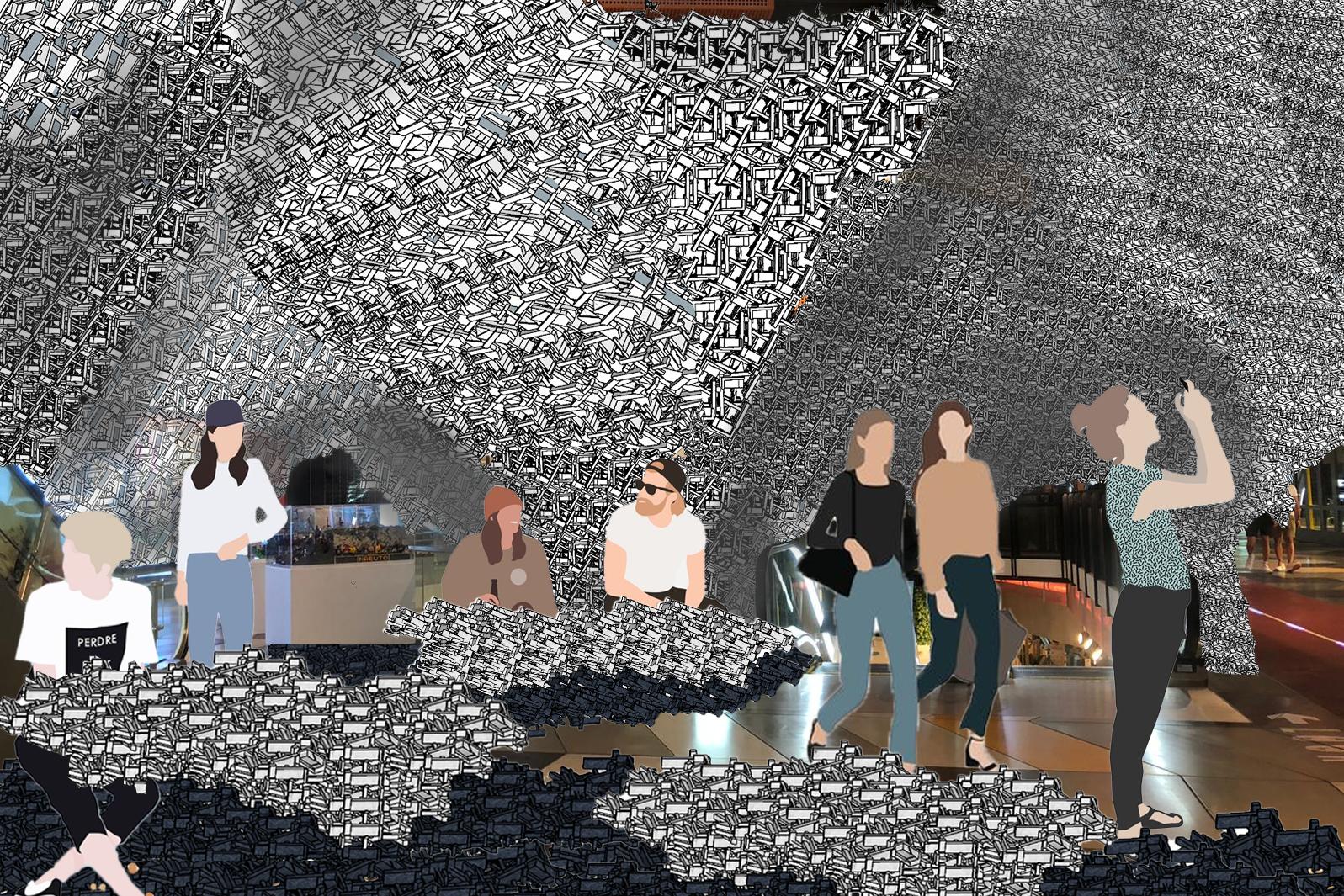 In an eye-catching mall like Funan, had to really make my design stand out. The form of the facade is inspired by crumpled pieces of paper. Different textures and quality of paper are used to experiment with folds and creases that add to the spatial qualities.