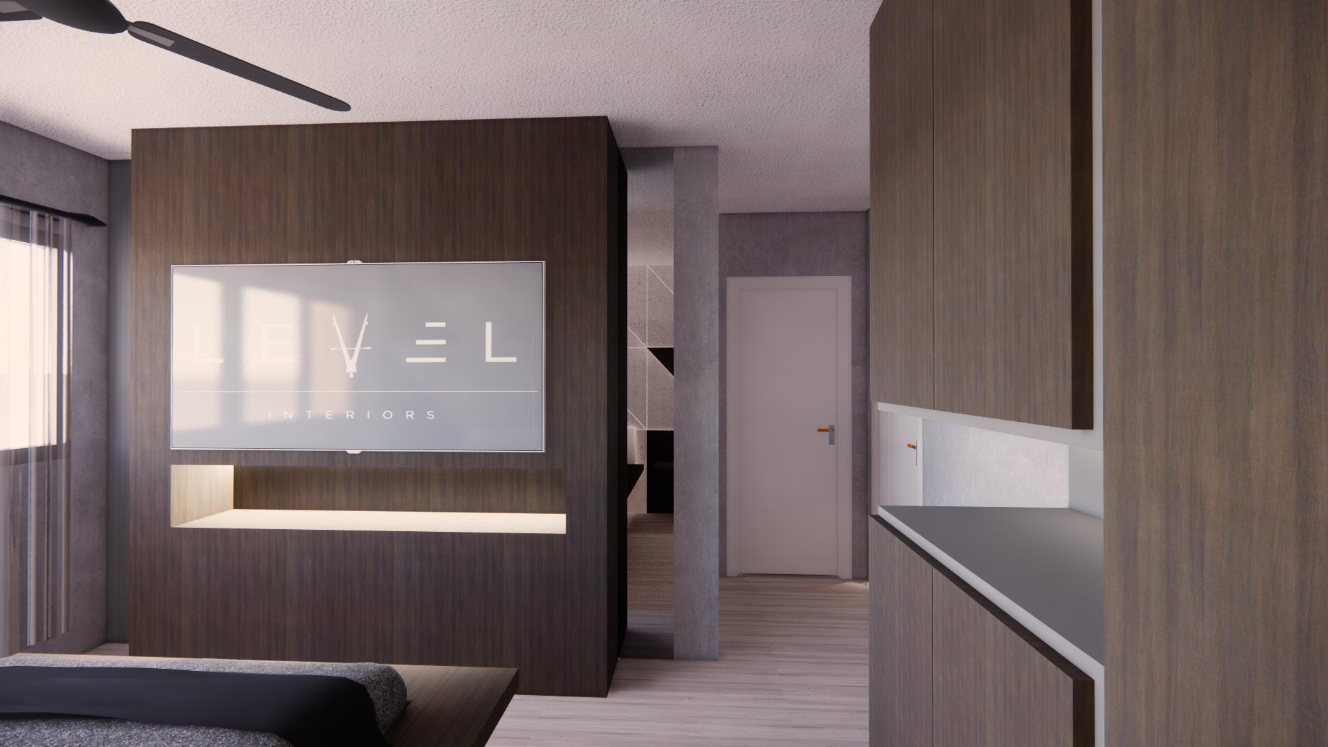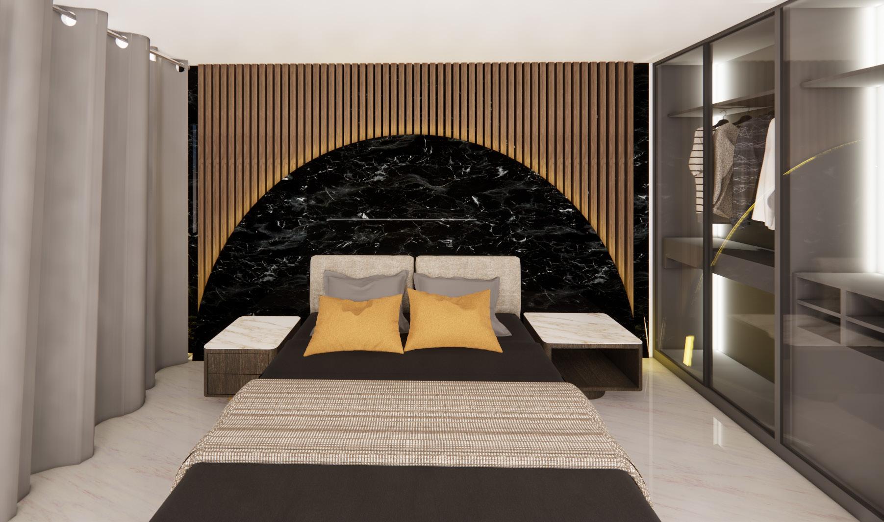 The feature for the master bedroom was designed to highlight the importance of the king-sized bed.Many layers were put into this feature wall, with the consideration of materials, such as the fluted panels and the marble arch and even the lighting on the walls. The design in this room is more grand and authoritive than the rest of the rooms in this house from the level of details to the materials. This bedroom in particular was made so the owners of this house feel like their house is like a 5-star hotel and bold designs did not scare them.