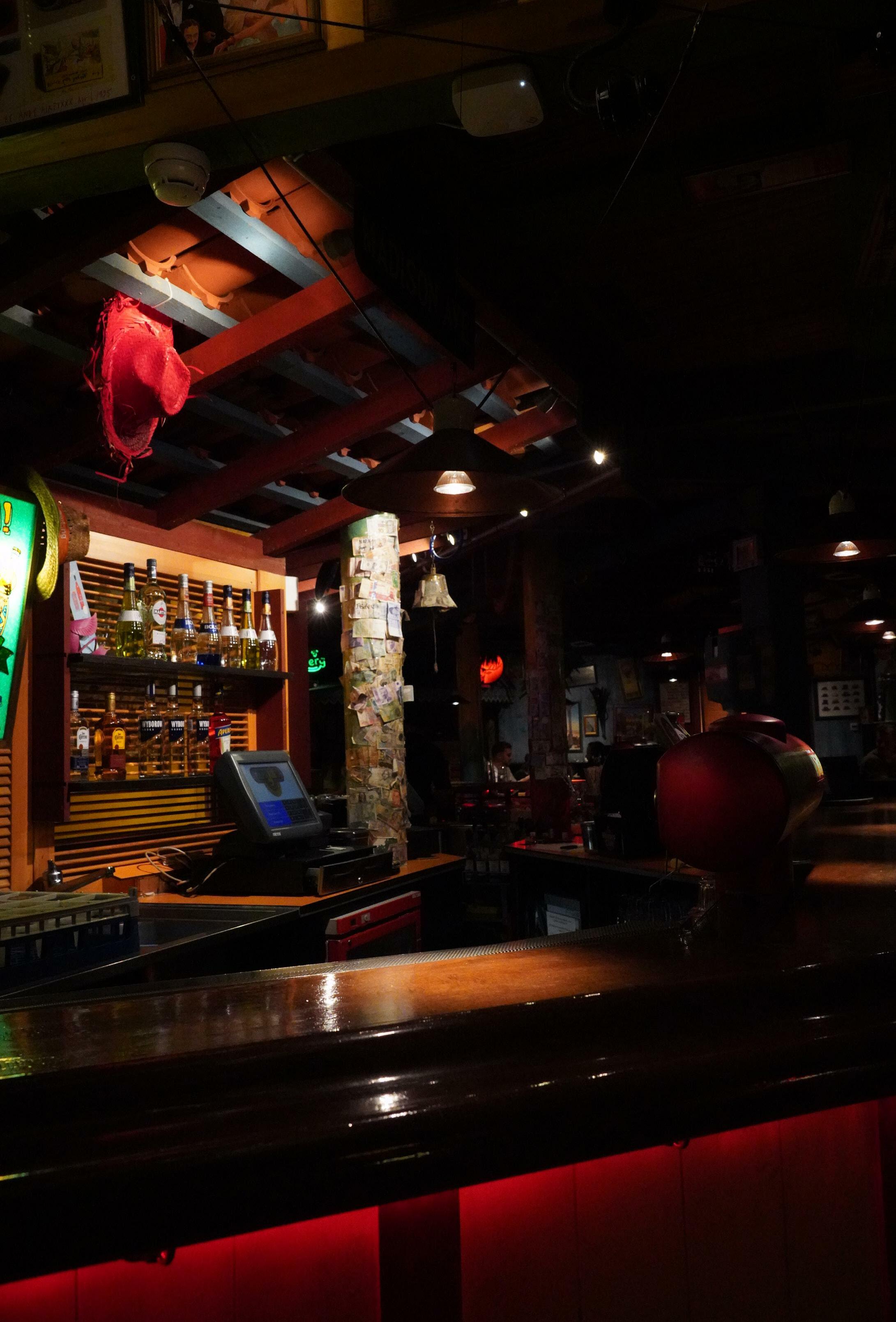 Full-height carpentry on back wall. Curved form that connects to seating area at the entrance.