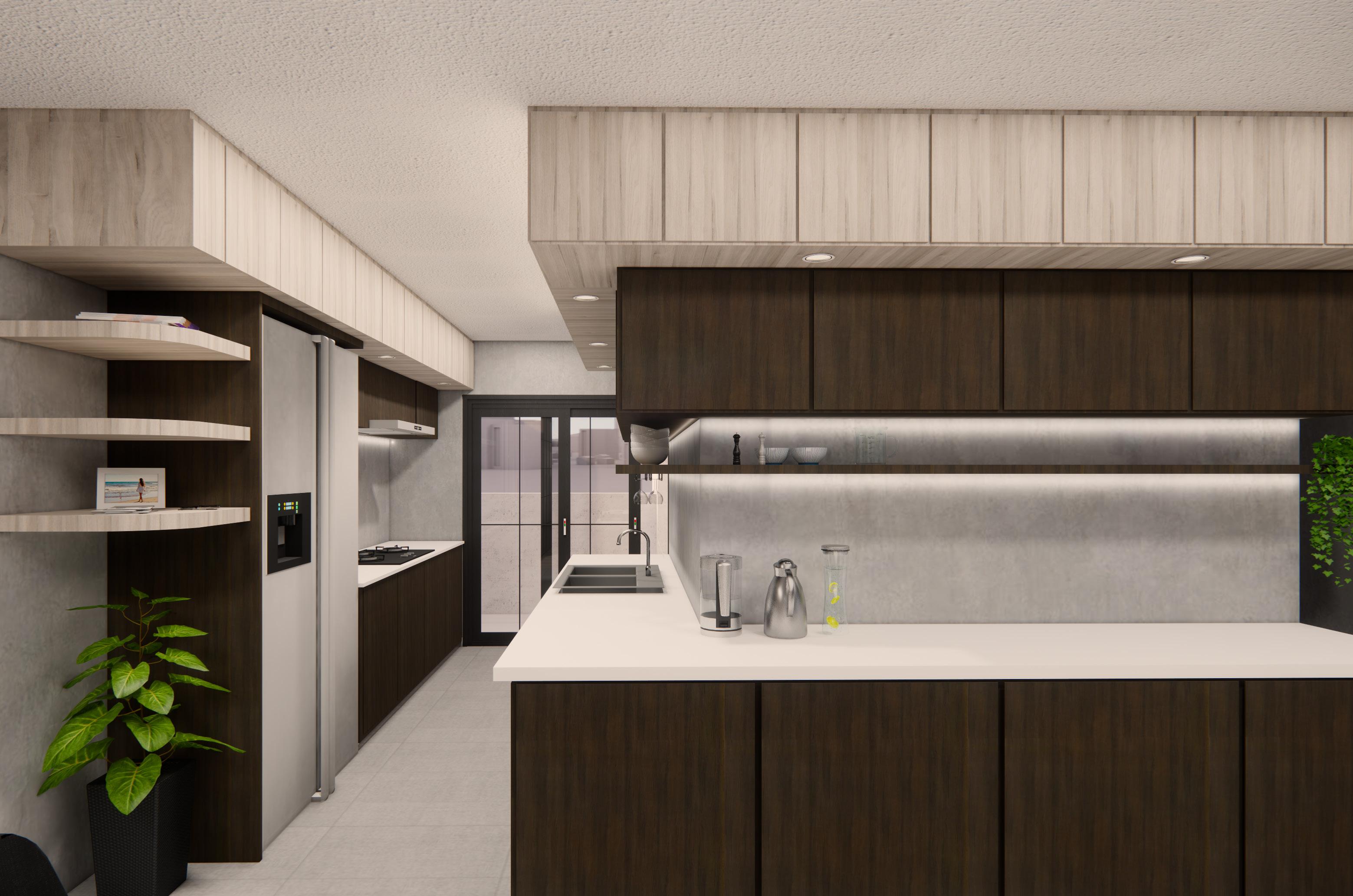 Open concept kitchen for a bigger appearance of the entire living and dining room. Layered top cabinets with different materials add more depth into the cooking space.