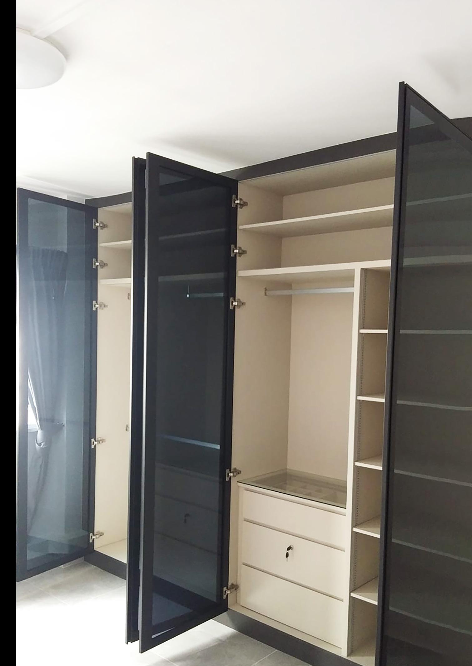 Built-in wardrobe with tinted glass doors and sufficient space for bag display.