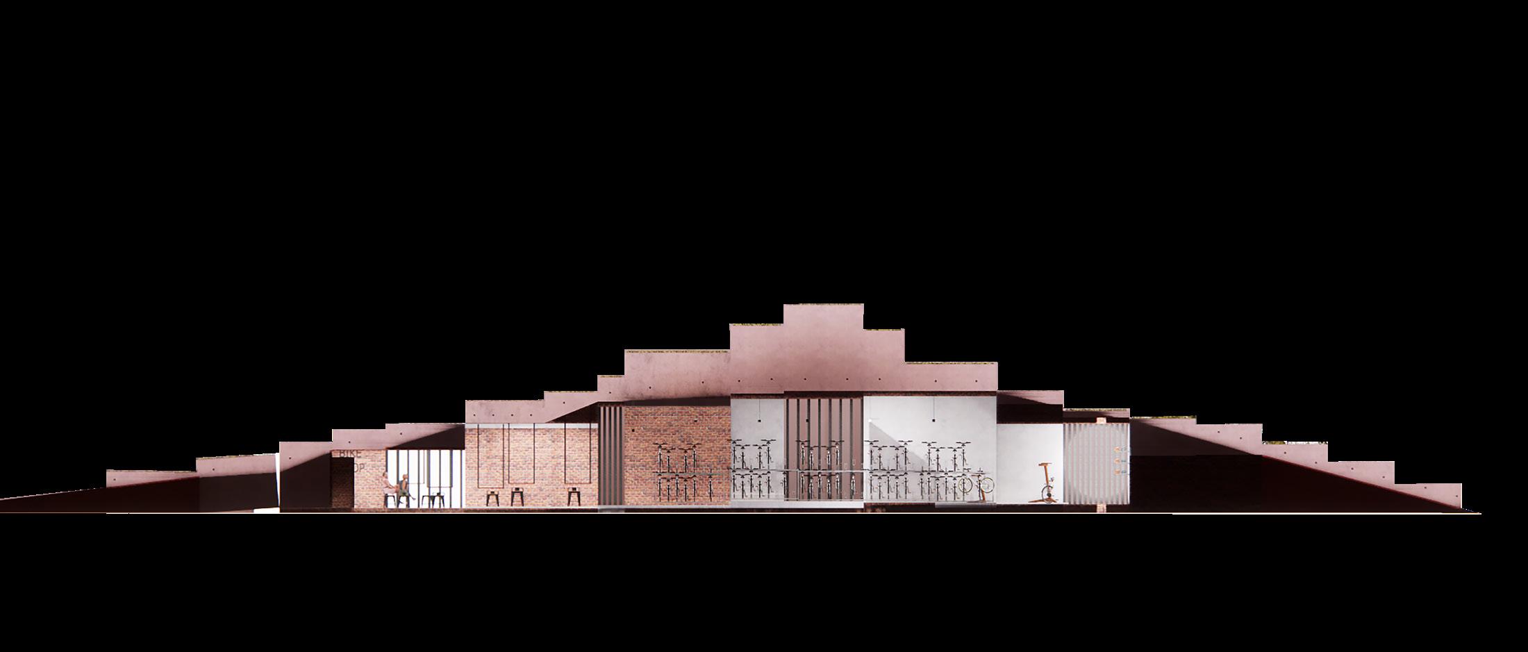 Zones in the Bike Stop includes counter and helmet display, bike display, bike repairs, dining area and lastly, fast lane. Within these spaces, concepts of lightness and ridgidness can be experience throughout the space. The form of this building was inspired by the oval shape I was trying to create and with a added geometric touch.