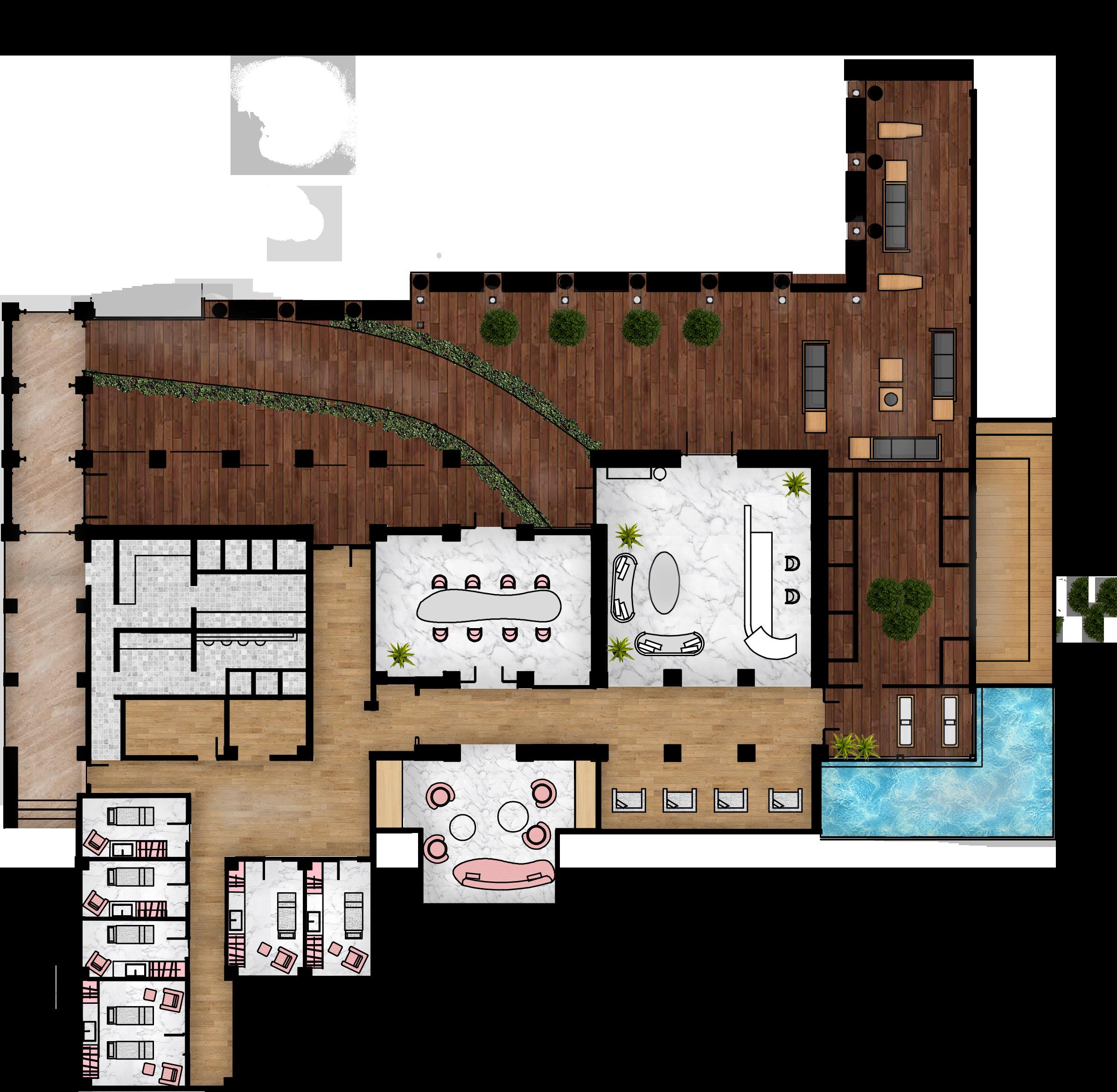 Waiting lounge, bathrooms and treatment rooms have to has to be within close proximity. Meeting rooms are to be tucked where customers will not be able to see or access. Destruction and construction of walls were kept to a minimum because of high costs. Other than the spa treatment, the four of us also decided on an area for a nail salon, sauna and a small swimming pool that over looks the green view. This gives customers a full luxurious experience when pampering themself at the spa.