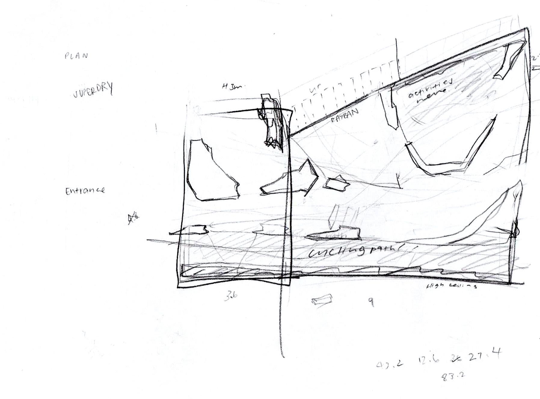 As shown on the right side of the page, I went with the first thing I thought about which was sharp iceberg-like shapes. Lineweights as well as dotted lines show the depth and x-ray of the space respectively.