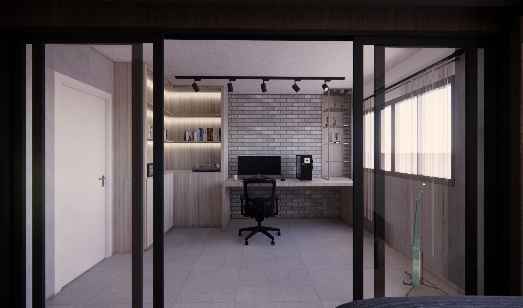 This project has a industrial modern theme and only master bedroom, living room and kitchen was required. Many dark woods, limewash paint were used throughout the residential area so as to make the space appear rustic. Only the kitchen, living room and master bedroom were required.