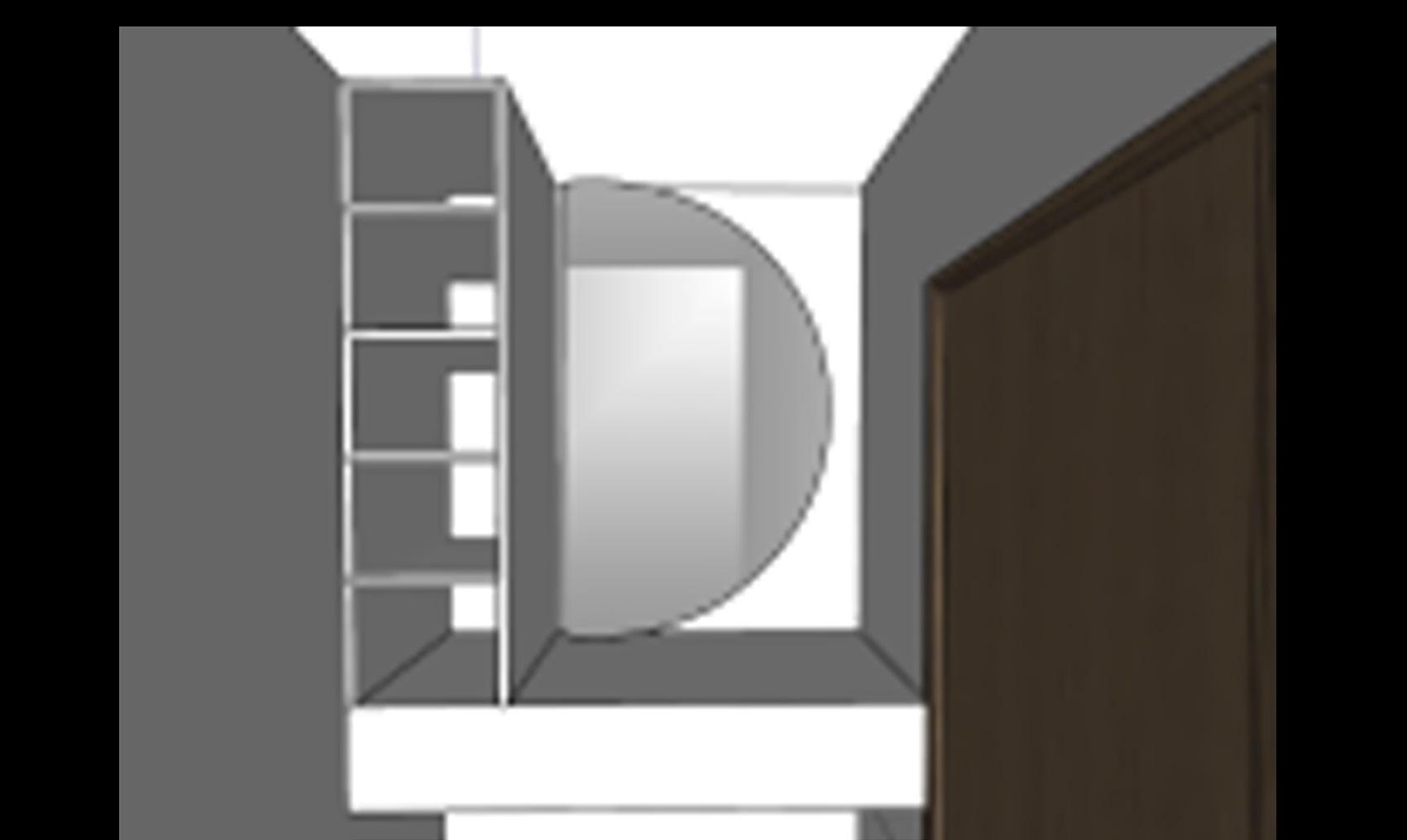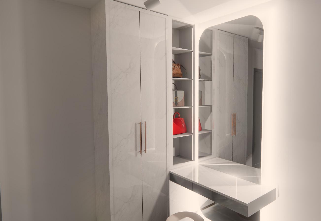 Full-length mirror and vanity open cabinets and full- height built-in wardrobe at the side for storage.