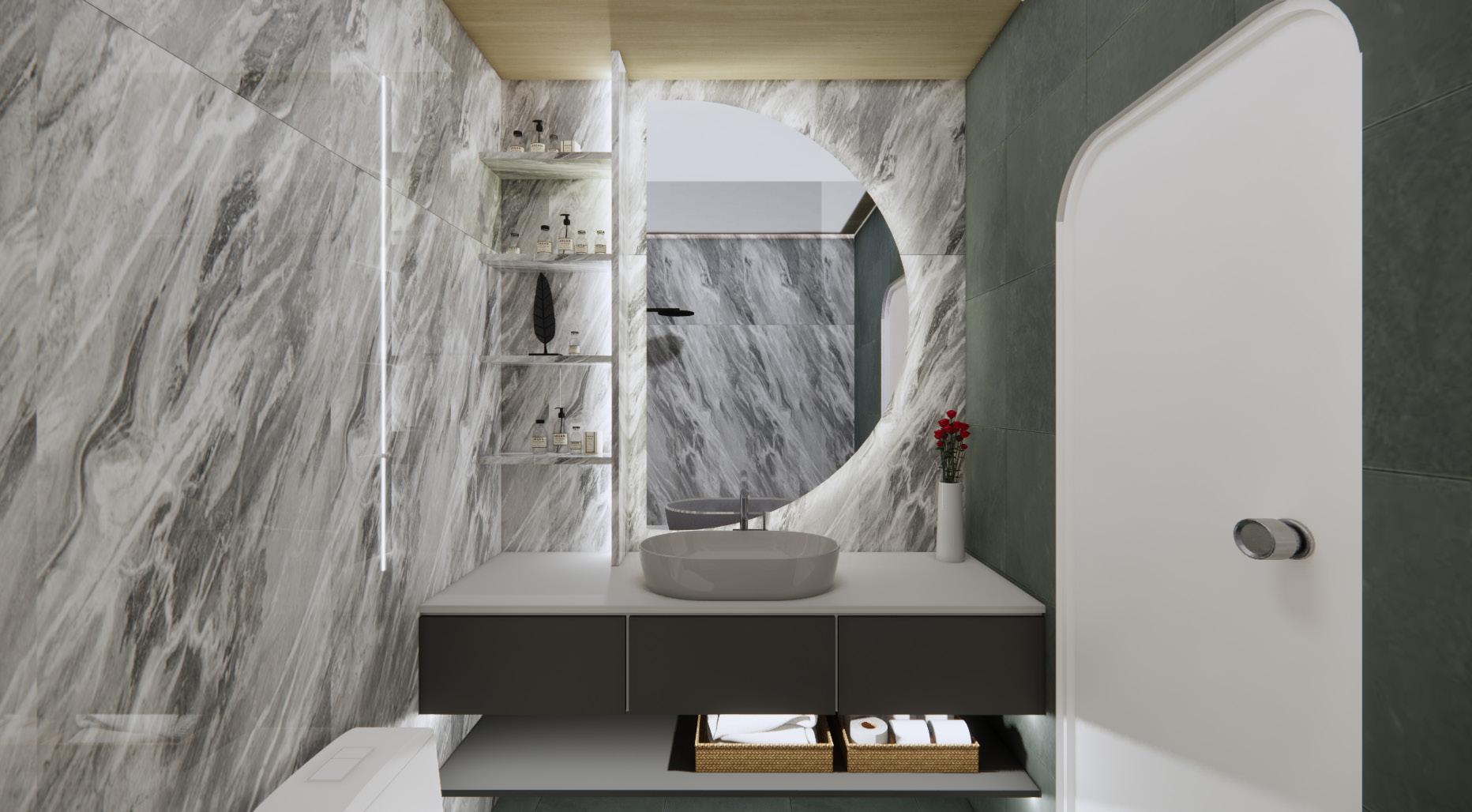 The most overlooked space in this house would be the common bathroom but I made sure to match the materials and design of this bathroom to the rest of the house. The most prominent object in this room, the semi circle mirror with back lights, brings a sense of luxury and focus when one looks into the mirror. The glossy marble laminates were used for an expensive look.