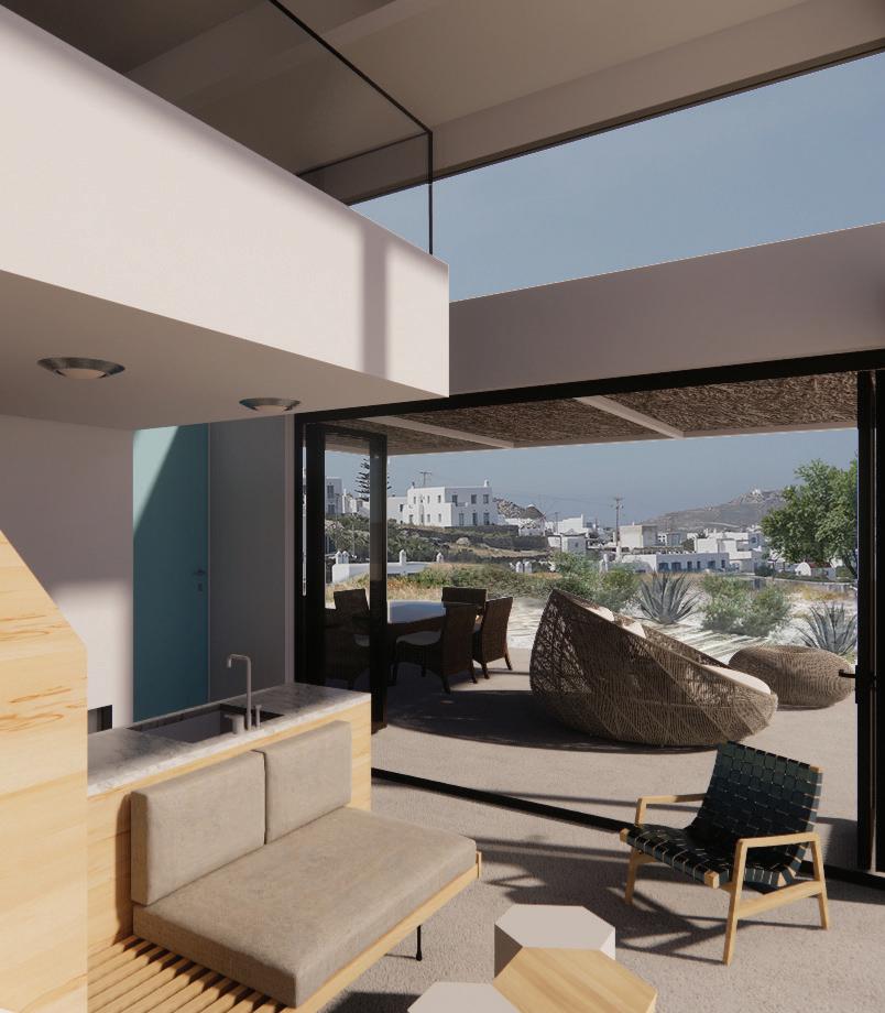 The project is a small getaway retreat guest house located on a property perching on the hill side of the Greek island Mykonos. The design adopts local traditional cycladic architecture style of white cubic houses, combined with contemporary design vocabulary such as asymmetric window openings and open interior space. The sweeping view of the picturesque village center and the Aegean Sea is emphasized by the expansive full wall window on the west side of the house and the glass wall of the loft. The house structure is limited to a footprint of roughly 275 sqft and 15 ft in height to avoid blocking the view of the main house. Outdoor shower, lounge and dining area adds living space to the limited interior space and works perfectly for the relaxing island lifestyle.