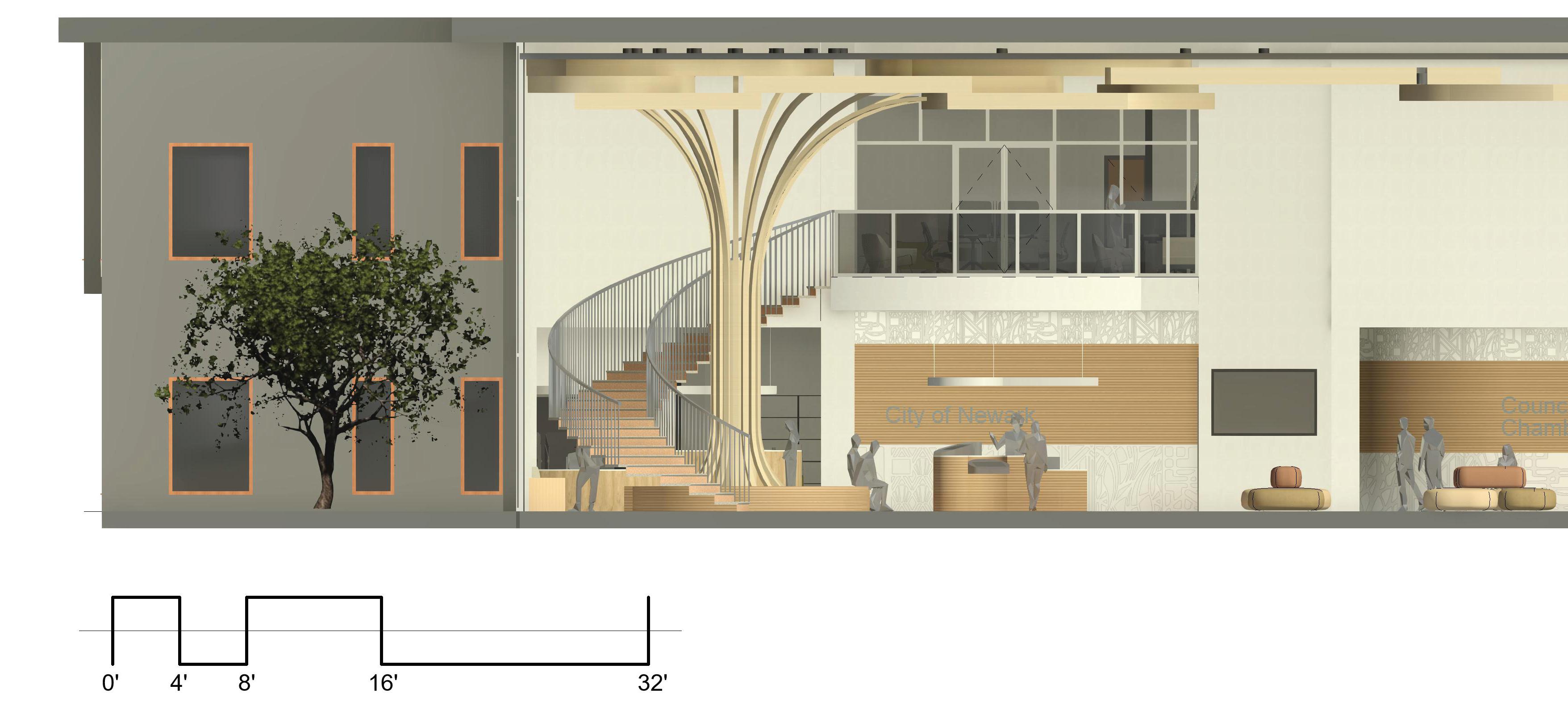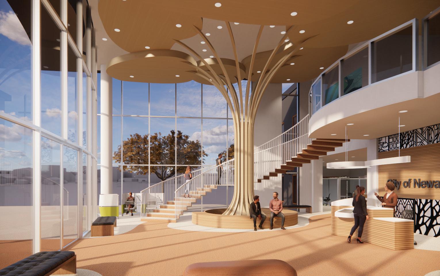 The design vision for the Newark City administration building is to create a space that showcases government transparency and democracy, while incorporating local natural, historical, and cultural elements to create a sense of community identification. The design uses cutting-edge technology to increase efficiency and enhance user experience. The goal is to create an efficient, customer-friendly service and community space, while also providing a modern and comfortable working environment for city workers and officials.