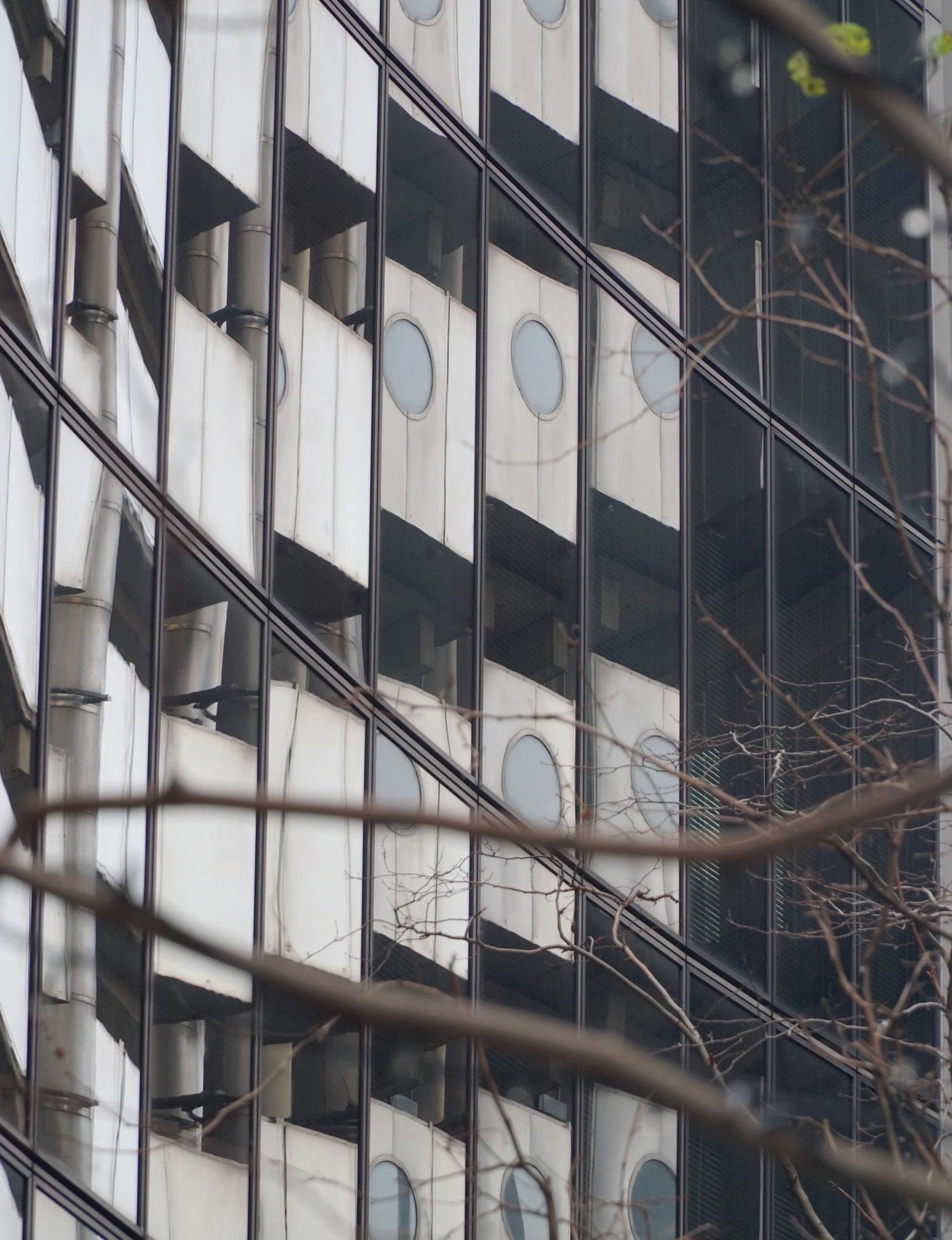 Floating ceiling panels add horizontality to balance the verticality of the tree structure