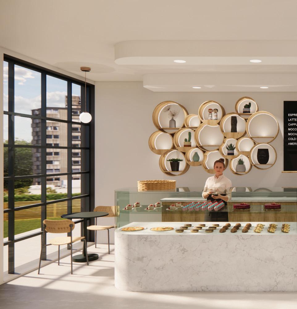 This project is developed as a Revit class assignment for a bakery/cafe in San Francisco located at the ground floor of a multi-use building. The overall design is sleek and minimal, yet cozy seating areas are provided for intimate conversations. Large fold-up window invites the outside in. Shelving behind the counter takes inspiration from the name of the cafe - Neverfull - as the water surface line of a half full cup transposed onto the round shape of cup openings.