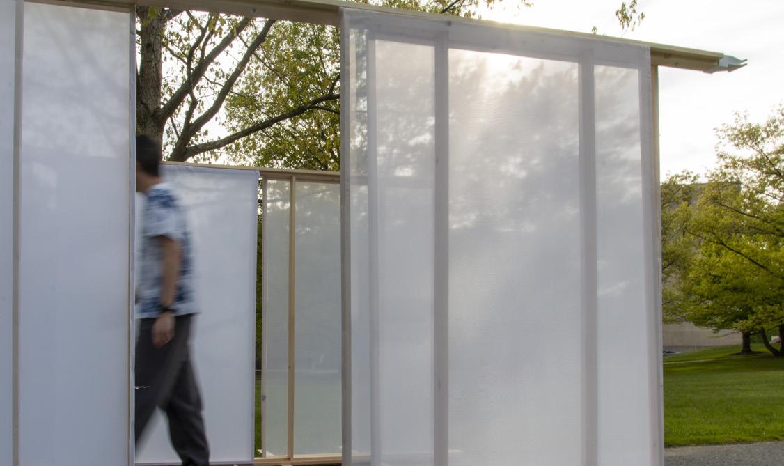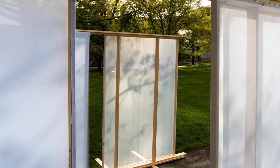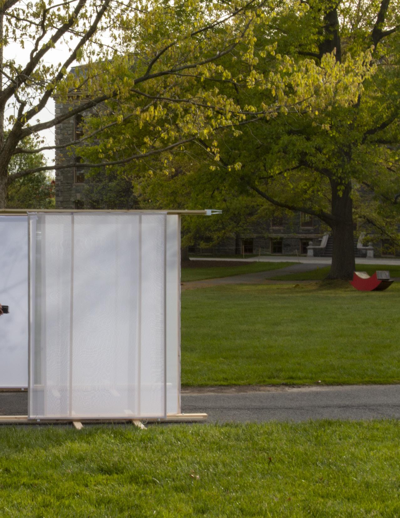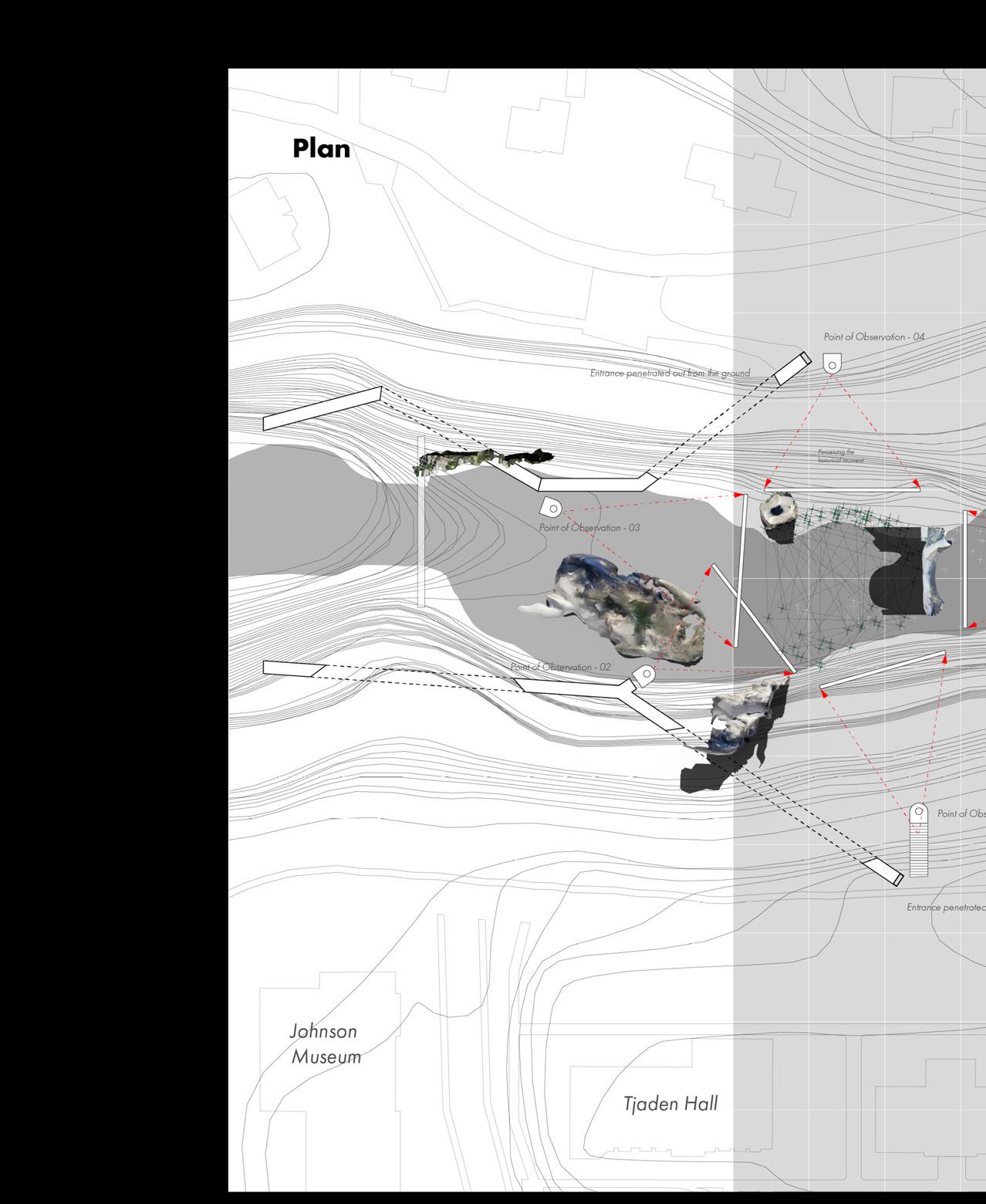 The location of the project is in the greenhouse of the Guterman Bioclimatic Laboratory on the Cornell campus. As a result of Robert Irwin’s influence, we are investigating the visual representation of light in order to make people aware of how light exists and shapes space. The existing lighting conditions in the greenhouse are tailored to plantation research. After capturing the inside space with photographs, time-lapse film, and photo scanning, we find it difficult to envision the project in a solitary area due to the vibrant and intense pink combination of light and plant. However the immersive environment renders feeling and perceiving light in such an unnatural world confusing, causing people to get overwhelmed and unable to focus on anything since there is too much going on (plants with light, metal sheet with light, ground, contrast between pink world and the outside). We wish to replace intuition with intent by manipulating the existing light in the existing world.