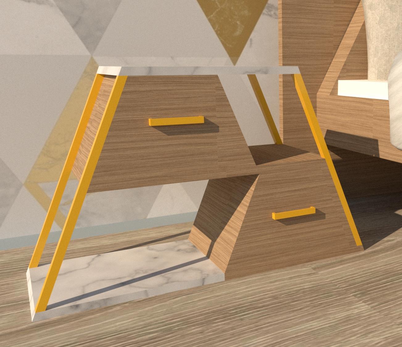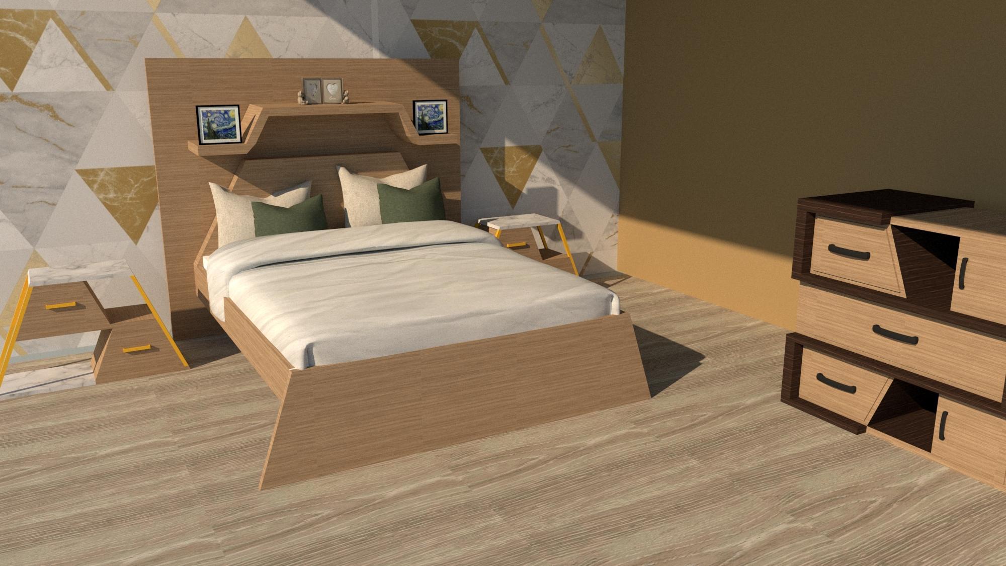 Onecommonelementinall3furnitureistheshape“Trapezium”Theheadboardand footboardofthebedisintheshapeofatrapeziumThebedsidetableisalsointhesame shape.However,thechestfollowsarectangularshapewithfewelementsofthetrapezium shape