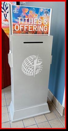 IfyoulookaroundFBCC,youmayhavenoticedafewnewadditions tothedecor.Outsideofthesanctuary,inthevestibule,andthe FellowshipHall,youwillfindnewFBCClogodecalsabovethe externaldoors.Thesesamedecalscanalsobefoundon theTithesandOfferingKiosks.