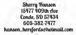 Sherry Hanson 15477 409th Ave. Conde, SD 57434 605-382-7477 hanson_herefords.hotmail.com