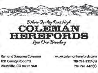 Canadian Customers Call:800-235-6140 Email: info@plainjans.com Custom Printed Gloves Call Today Call for Special p lain j s a n www.plainjans.com 800-235-6140 US Customers 620-872-5777 Canadian Customers Call:800-235-6140 Email: info@plainjans.com Custom Printed Gloves Call Today Call for Special Utah Line One performance bred Herefords www.johansenherefords.com Castle Dale, UT Jonathan 435-650-8466 Craig 435-820-8490 LIETZAU HEREFORD FARM Harold & Connie Lietzau Troy, Michelle, Jaydon, Devon & Jocelyn Taylor & Ty 7477 Iband Ave. • Sparta, WI 54656 Cell 608/633-2875 - Harold Cell 608/487-0015 - Taylor Cheryl and Tracy (715) 247-5217 Lance Brent (715) 377-6876 (715) 760-1727 wirthherefords@gmail.com WIRTH Herefords NEW RICHMOND, WI Steve Merry 1840 Co. Rd. CC • Hartford, WI 53027 Dr.Steve.Merry@gmail.com • 414-881-5274 6 Generations of MERRY Polled Hereford Breeders — Spanning 120 Years Wyoming Jay and Janice Berry 3049 County Road 225 Cheyenne, WY 82009 (307) 634-5178 E-mail: jaberryherefords@msn.com www.WhereCowmenBuyBulls.com Bull Sale December 2024 WHERE COWMEN BUY BULLS The Berry’s • Gene & Cindy Stillahn and Family • Christopher, Amy and Trey 3902 County Road 203 Cheyenne, WY 82007 (307) 421-1592 cell E-mail: stillahn@gmail.com • Sale November 21, 2024 • LARGENT and SONS Hereford Cattle Since 1902 P.O. Box 66 • Kaycee, WY 82639 (307) 738-2443 or (307) 267-3229 www.largentandsons.com largentandsons@yahoo.com McClun’s Lazy JM Ranch McClun Ranch 1929 Road 60 • Veteran, WY 82243 Sale April 11, 2024 Producing problem free Polled Herefords and Angus. Jeff 307/575-2113 Kody 307/575-3519 Jim 307/534-5141 jkmcclun@wyomail.com Joel & Karri White 104 Blackfoot Court Buffalo, WY 82834 C: 307.217.0367 joelkarriwhite@msn.com Bulls, Females, Embryos & Semen Available Private treaty sales any time. PRIVATE TREATY SALES OF HEREFORD AND ANGUS BULLS REGISTERED AND COMMERCIAL BRED HEIFERS QUALITYBULLS.COM E-MAIL: OCHSNERRANCH@GMAIL.COM Blake & Chrissy Ochsner 307/532-3282 Rustin & Britte Roth 307/575-2709 Steve & Dixie Roth 307/575-5258 Rod & Debbie Ochsner 307/575-2589 B.W. & Terra Ochsner 307/575-6772 Ochsner Roth Cattle Co. Sticks & Stones Ranch EXCELLENCE IN LINE 1 BREEDING SELECT POLLED GENETICS CATTLE SUNDANCE, WY 307.281.5896 BILL WILHELM 1046 RIFLE PIT RD., SUNDANCE, WY 82729 POLLED HEREFORDS Ned & Jan Ward 406/757-0600 Ned (c) 307/751-8298 • Jan (c) 307/751-9470 Jake Bare (c) 406/780-0056 • Bell Ward (c) 307/751-6922 Emilee Holt 208/965-3130 P.O. Box B • Sheridan, WY 82801 njwardherefords@gmail.com NEW RANCH LOCATIONS! NORTH RANCH: 2637 Adsit Rd., Decker, MT SOUTH RANCH: 888 Lower Prairie Dog Rd., Sheridan, WY www.NJWHerefords.com • Bull Sale in March South Dakota (continued) Services Texas Wisconsin Phone (605) 523-2655 Matt (605) 310-5782 cell hrzens@yahoo.com www.zensherefords.com Harley, Matt & Mark Zens Canova, SD 57321 Bulls, Heifers and Show Steers Private Treaty Sales POLLED HEREFORDS Since 1947 SETH WOOD WOODCREST FARMS Cresbard, SD 57435 (605) 324-3289 Seth (605) 626-1643 Bulls and Heifers for sale at the farm Bull Sale • February 22, 2025 Reese & Elly Jo Wagner 39365 182nd St. Redfield, SD 57469 Reese 605-450-1085 Elly Jo 605-450-9790 wagnerherefords.com Zens Herefords Washington Bill and Terrilie Cox 688 Pataha St. Pomeroy, WA 99347 509-566-7050 Kayla Slaybaugh 509-254-3918 Hereford2005@outlook.com Annual Production Sale 2ND FRIDAY IN FEBRUARY Lewiston, ID BULLS & FEMALES SELL matt@steerin.com Toll Free: (877)335-5372 CSU Acclaim 77 Grady Grande Loewen K2