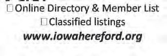 1 Snowshoe Cattle Co. Sale Ar thur, NE 4 BOLD Leadership Conference Desdemona, TX 11 McClun’s Lazy JM Ranch Sale Torrington, WY 12 Thorstenson Herefords Sale Selby, SD 13 Ellis Farms Bull & Female Sale Chrisman, IL 13 Knoll Crest Farms Spring Sale Red House, VA 13 NJHA Fed Steer Shootout Field Day Scott City, KS 14 Sandrock Ranch Herefords Annual Production Sale Benton, WI 16 Larsen’s Polled Herefords Sale Atkinson, NE 20 Stuber Ranch Annual Bull and Female Sale Bowman, ND June 7-9 Nebraska State Hereford Show (NJHA) Kearney, NE 8-9 SD Junior Hereford Field Day Sioux Falls, SD 21-23 Midwest Classic Pipestone, MN July 6-12 “Grandaddy of ‘Em All: Junior National Hereford Expo Grand Island, NE 23-27 Canadian Junior National Hereford Show Bonanza 2024 Brandon, Manitoba 24-28 SD Summer Spotlight Show Huron, SD 28 Faces of Leadership Conference Fort Worth, TX CALENDAR OFSales & Events Don’t Miss It! Photo by Jonathan Johansen The ad deadline for the September issue of Hereford America is August 5. If interested contact Jill Hotchkiss at 605/490-1409 or Email: jbh@herefordamerica.com September is the next issue and comes out in August