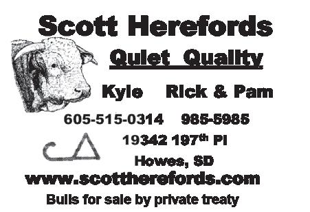 Tricky’s Herefords Dick & Betty Wettlaufer (605) 485-2648 • Cell: (605) 270-3465 44132 234th St. • Winfred, SD 57076-7318 E-mail:rwettlaufer@triotel.net www.TrickysWhitefaces.com BULL SALE • March 28, 2024 • Winfred, SD S Brian & Colleen Simon Seneca, SD 57473 Cell: 605/765-4564 Home: 605/436-6725 imon Herefords bcsimon@venturecomm.net www.simonherefords.com Selling bulls & heifers private treaty. Low maintenance, feed efficient Hereford cattle KLAGES HEREFORDS Sherry Hanson 15477 409th Ave. Conde, SD 57434 605-382-7477 hanson_herefords.hotmail.com Joel & Pam (Hanson) Singrey 18155 440th Ave. Hazel, SD 57242 605-216-3528 Pam 605-261-5993 Joel pam_hanson@hotmail.com Hoven, SD 57450 • Sale Third Mon. in February • Shannon: 605-769-0203 #1 Dams of Distinction Herd in America RAUSCH HEREFORDS jacob@rauschherefords.com www.RauschHerefords.com