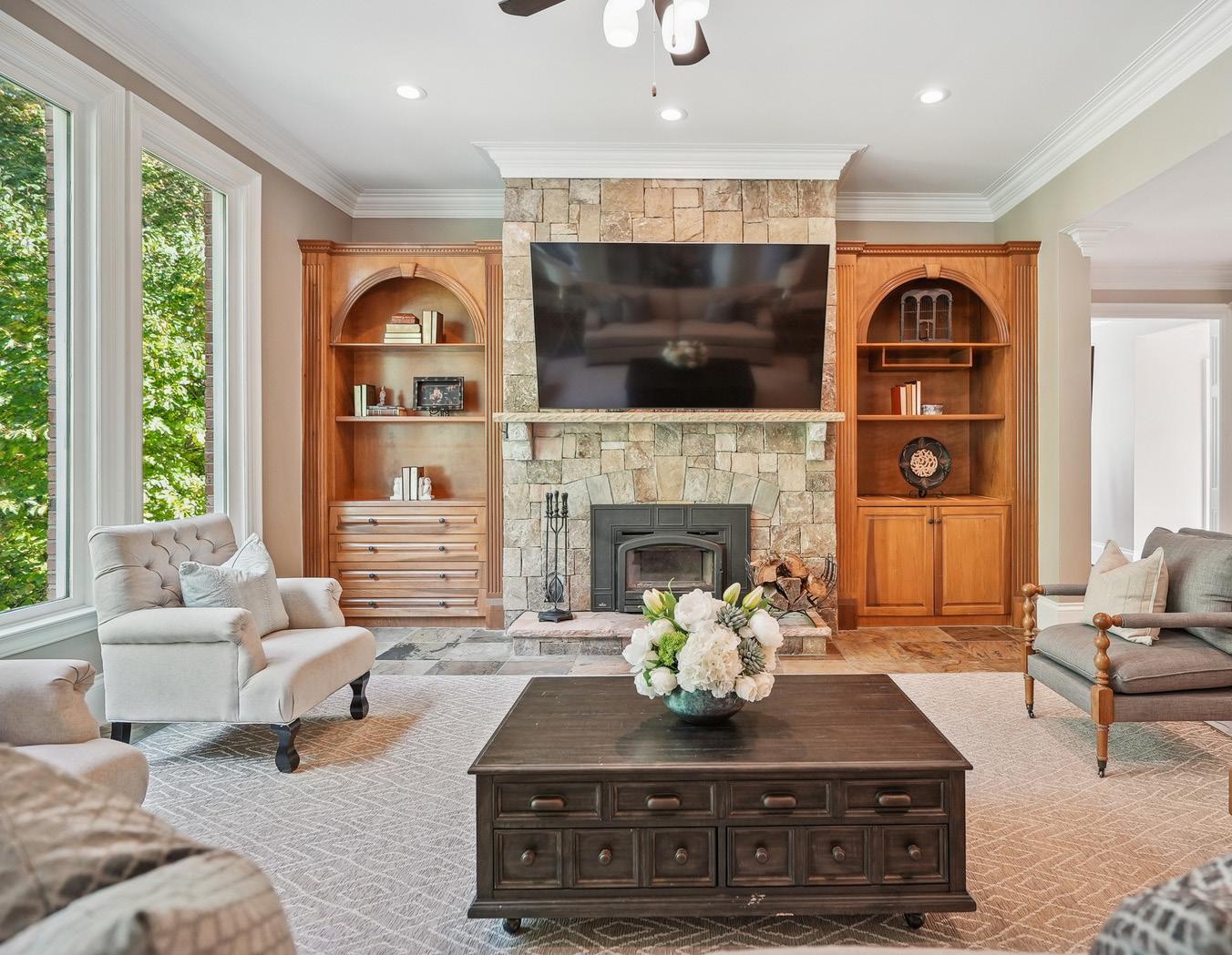 The executive office provides the perfect space to Zoom away, featuring high ceilings and lots of natural light, which showcases the rich wood details. The formal and informal family and dining rooms, complete with a wet bar, are perfect to host a big Thanksgiving! Impress your guests with a meal for the ages from your chef’s kitchen featuring a Wolf gas range with griddle, custom-designed vented hood, enormous pantry, and a breakfast bar that could easily seat 8! Then watch the game in the family room with a stacked stone fireplace, featuring a Napoleon wood-burning insert while enjoying the stunning nature views.