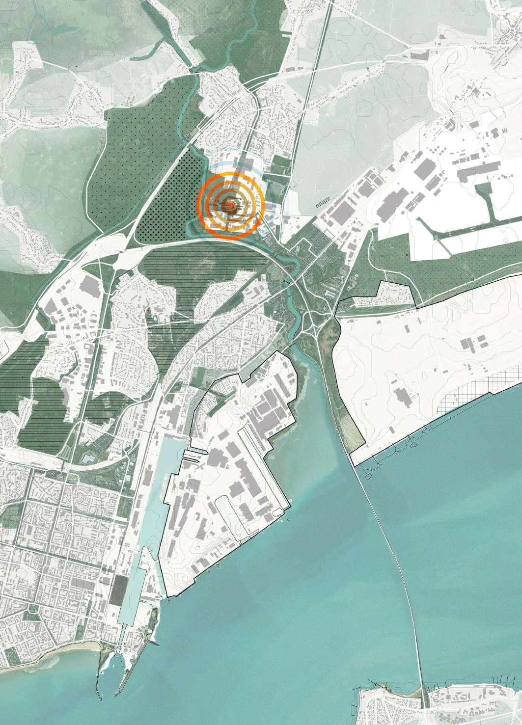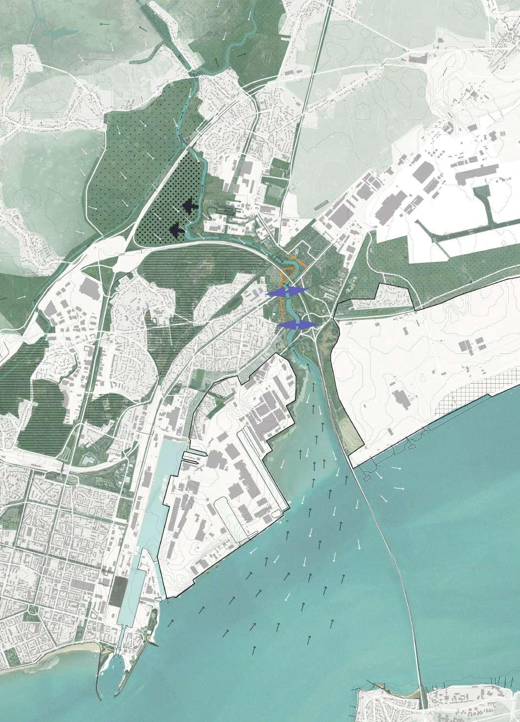 Le système de parcs vient s’insérer dans le maillage de Saint-Nazaire et s’éclate vers le nord en suivant l’axe du Brivet, celui qui donne la forme, qui centralise le projet. Ces axes s’accrochent également aux villes périphériques est.