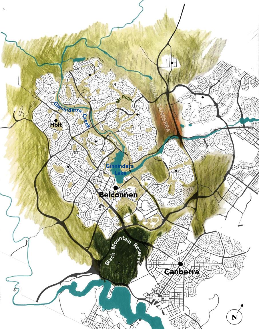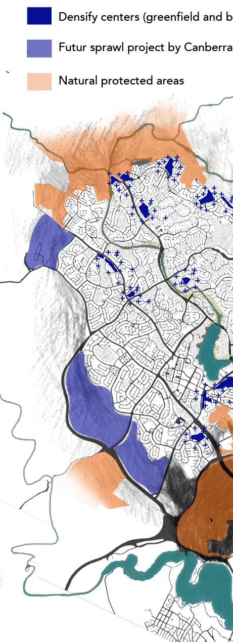 Ce projet autour de la ville de Canberra consistait à identifier proposer des solutions qui répondent aux enjeux climatiques et problématiques territoriales majeures, le feu et l’étalement urbain étaient au cœur du sujet. Canberra fut arbitrairement découpé en 9 tranches, par les en seignants et pour que chaque groupe d’étudiants propose des projets propre à leur site d’étude. Le site d’étude fut le quar tier Belconnen, il s’est étendu après la ville centre, selon un mo dèle d’urbanisme de lotissements immenses, semblable au pa villonnaire américain. Ce quartier est assez dynamique grâce à sa zone d’activité et à l’université de Belconnen, proche du lac de Gininderra. Ce lac forme une structure paysagère importante dans le quartier, les cours d’eau qui l’alimentent et se déversent offrent de grands espaces ouvert, souvent asséchés en été. Ce pro jet s’applique sur des échelles relativement grandes, car Belconnen s’étend sur 17 kilomètres de long. Le projet multiscalaire, ça a été de penser des principes d’aménagements qui peuvent être appli qués à plusieurs sites dans le quartier afin d’impacter la grande échelle et ensuite de répondre aux problématiques.