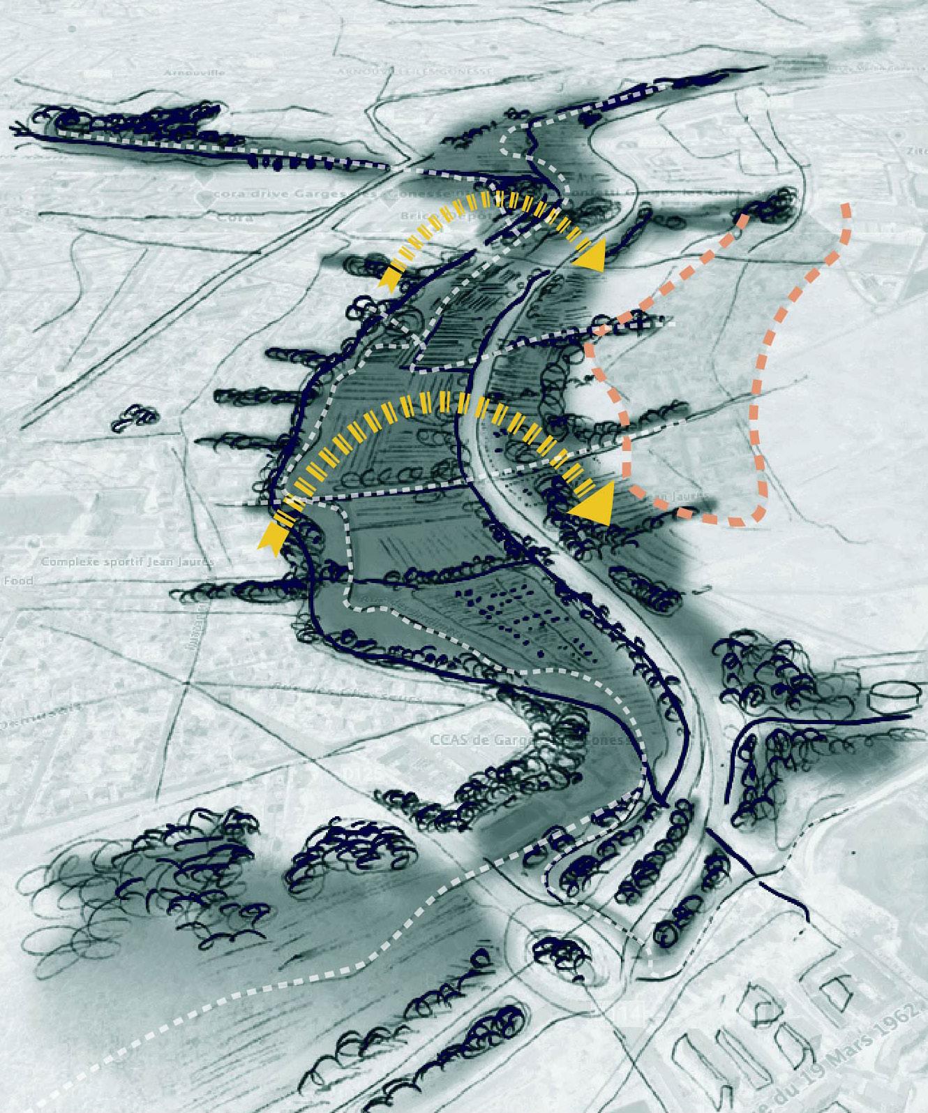 Mon objectif a été de définir les bienfaits possibles de retrouver un échange naturel entre l’estuaire de la Loire et ses marais. Comment cela pourrait redonner un souffle aux écosystèmes, à la régénération des milieux et aux paysages agricoles, afin d’anticiper un changement inéluctable. Les prospectives employées dans ce projet sont à horizon 2100, par ailleurs, le niveau d’eau continuera de monter, et les milieux, à s’adapter. Le système de parcs suit le lit majeur du Brivet et s’étend dans les bras submersibles de Saint-Nazaire