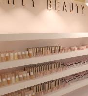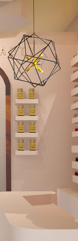 The amber glass and gold accents are inspired by the new Fenty Perfume that is amber glass with gold accents. This new perfume is seen being displayed in the back of the store.