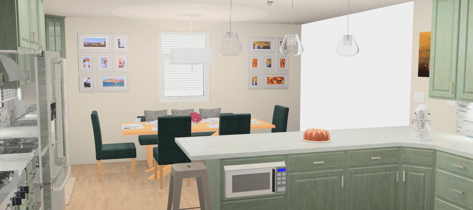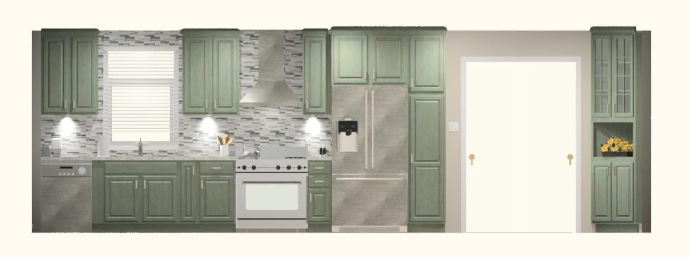 My client’s current kitchen is functional; however, it doesn’t please the eye and it doesn’t allow them to enjoy their kitchen and cooking in it. They currently do not have enough cabinet space, they don’t like the materials used in their outdated kitchen, however they do like the layout, they just wish to have a bit more seating. They also wish to have a larger range, sink, and upgraded appliances to benefit them and their routinely cooking. For my client, they want to accomplish a modern farmhouse design for their kitchen, and they want to incorporate sage green cabinetry.