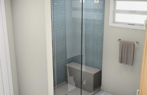 My clients wanted to achieve an airy look while updating their bathroom. They wanted a glass panel shower, with a colored tile that will allow the owner to unwind at the end of the day. My clients also wanted patterned ceramic tile for the flooring, instead of their existing laminate. The biggest change they wanted was to get rid of their tub, and just have a walk-in shower. This would add an updated and modern look to their small bathroom. The owners did not want anything too special, just rainfall showerheads and integrated speakers. The only other requests were to incorporate a shower seat and niches to hold any products. In the end, the refreshing and modern look is what they are looking for
