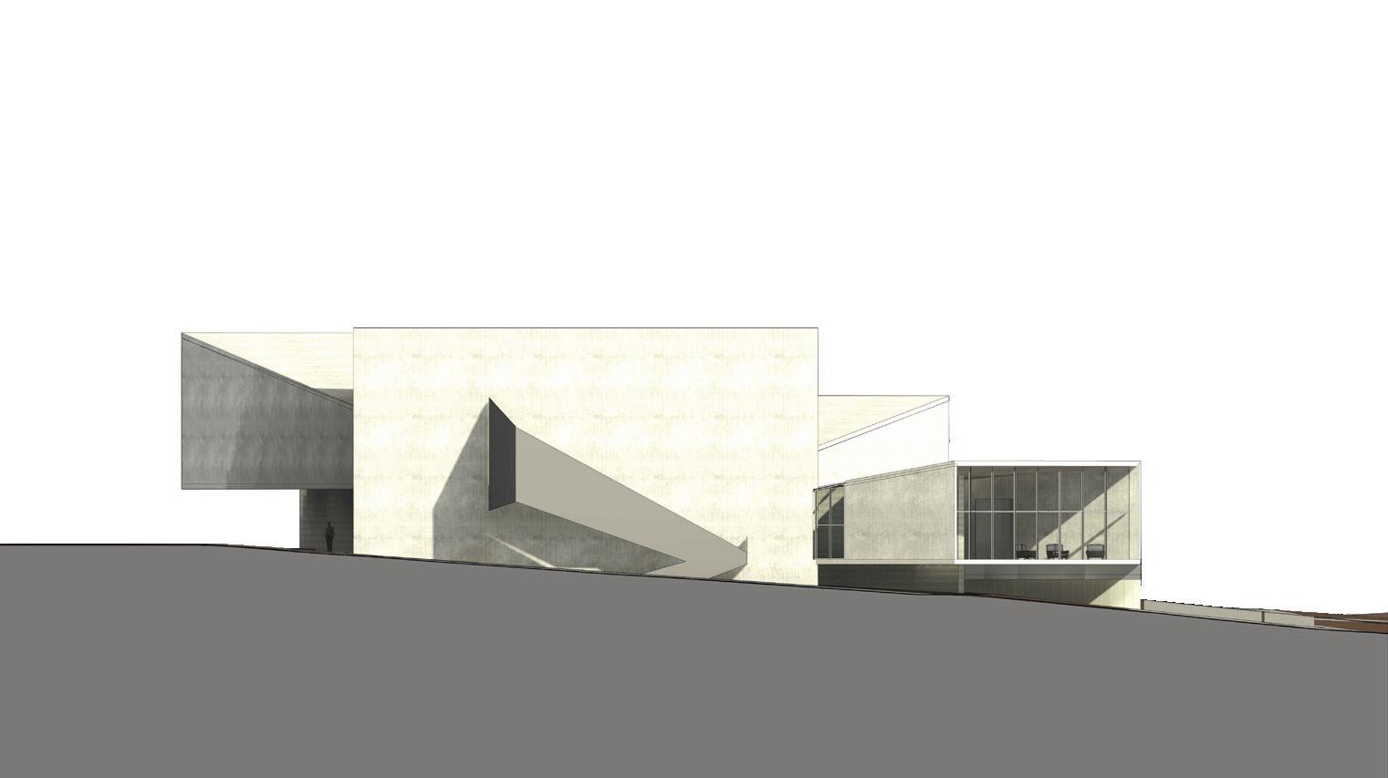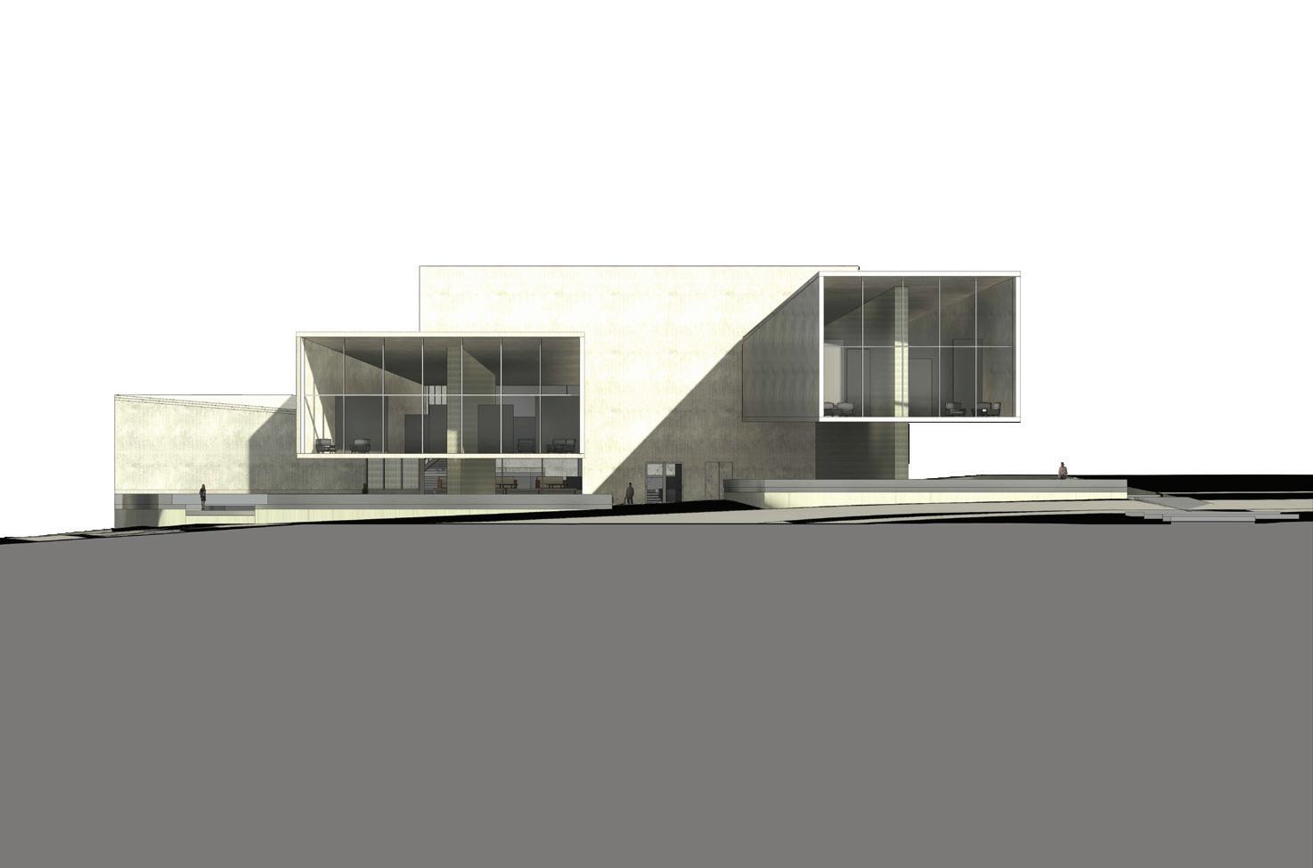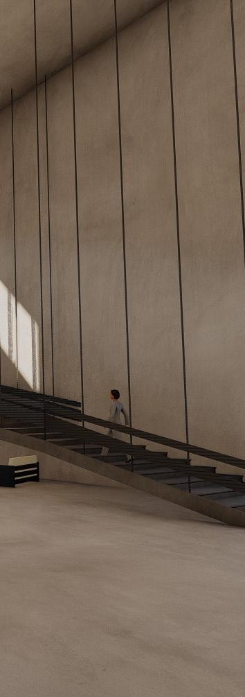 The experience of this building is to mimiic the college experience. You enter through a long pathway on the North wawlking next to a large solid wall to enforce the feeling of being small when beginning the college journey. When you enter it opens to the lobby and columns that hold up the above conference room lead you to the first room to experience, the Memory room. In that room and each of the three main rooms, there are partitionwalls to push you through the room and back. That leads you to the grand staircase that will lead up to the Present and Future room. There are two other stairs, one to take employees to the private basement for storage and office spaces, as well as a secondary from the top floor conference room. Through the lobby you can access the cafe and shop area to the other eneretance/exit on the west side of the building that leads you out to the outdoor seating areas meant to be used by students to gather or relax in between classes.