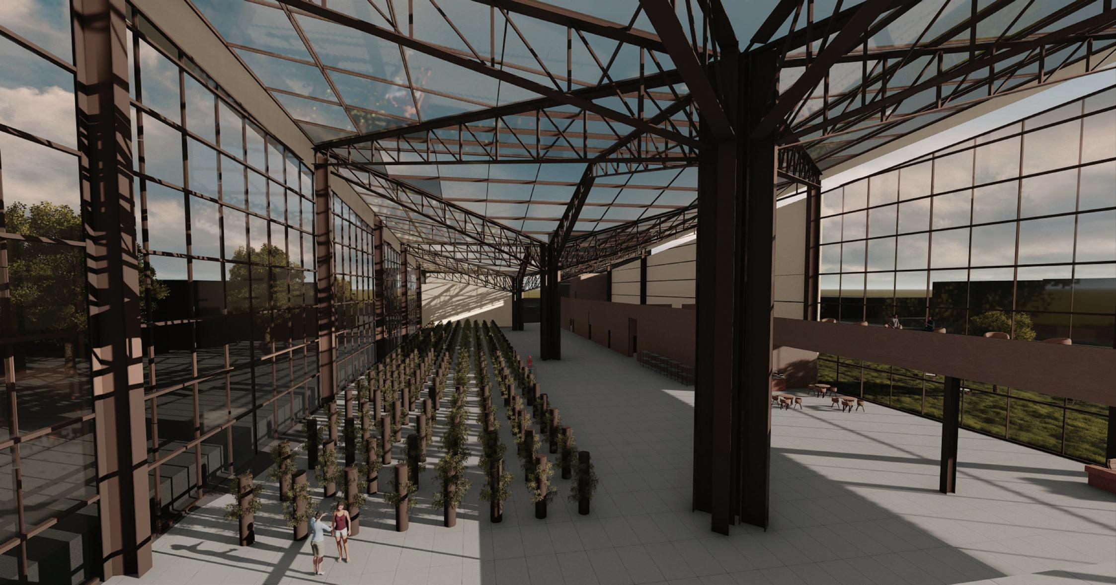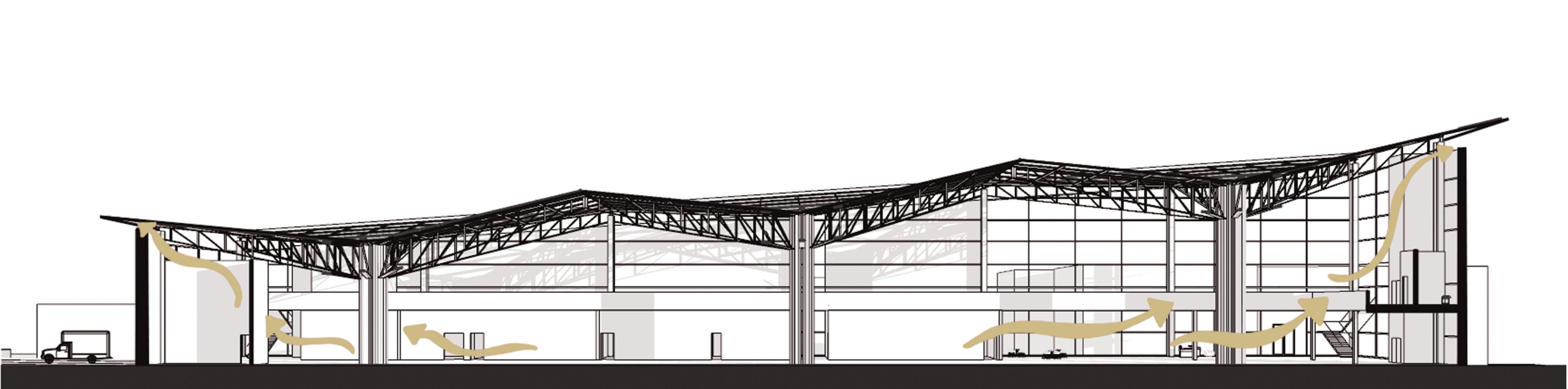 The concept that drove my design is water conservation. I created these water catching roof funnels that attach to the columns, that carry the water into a reservior underneath the building. The water can then be reused on the plants inside the facility.