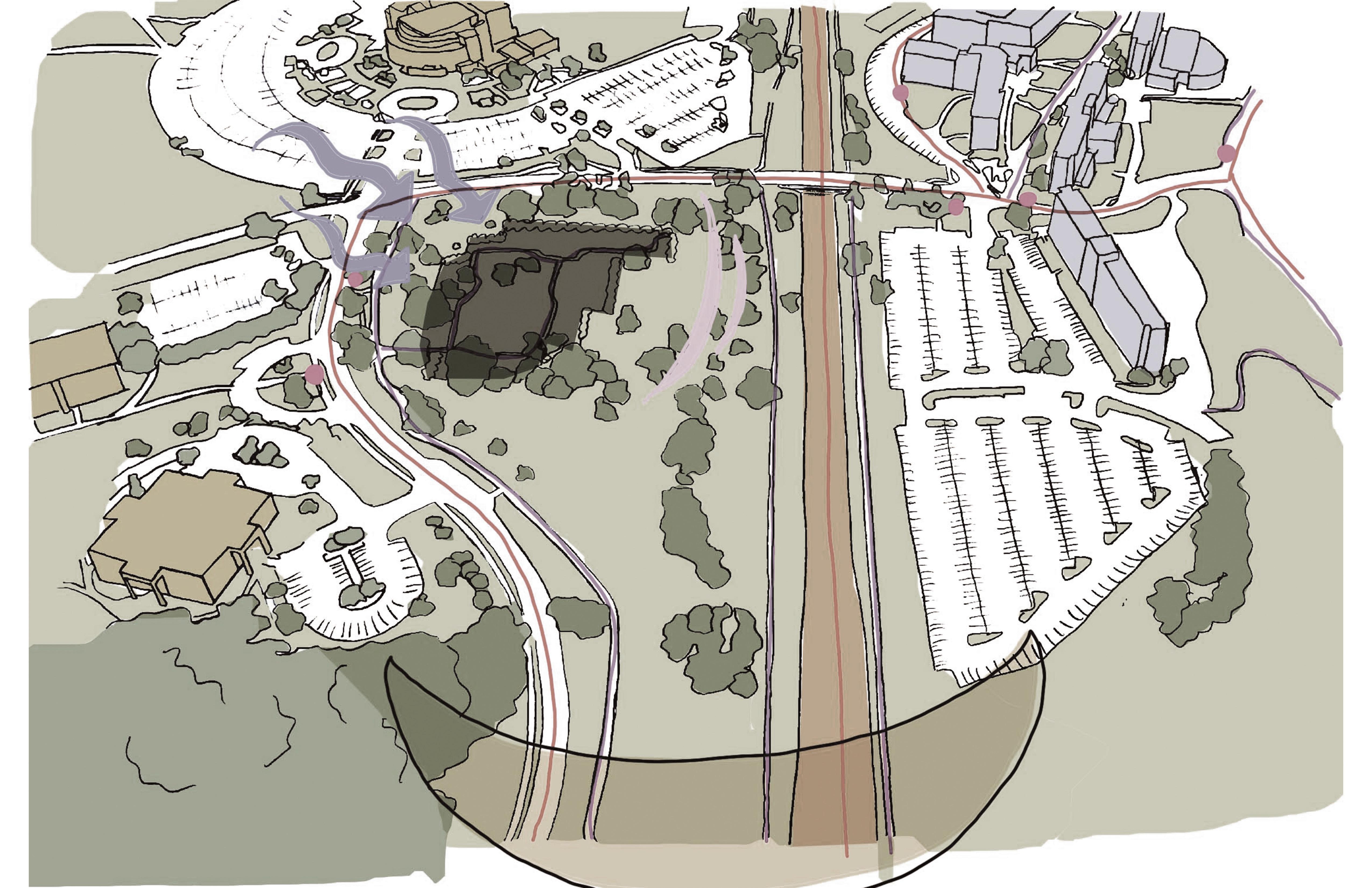 The parking lot existing in front of the site is very useful but in addition I added a small parking lot to the west of the building near the main enterance, located on the north west face of the building. I decided the best area for truck enterances with output and input of supplies is best on the east side and off of Armstrong Ave. to avoid unnessecary traffic. The elements of the sun and wind influenced the other parts of the projects program.