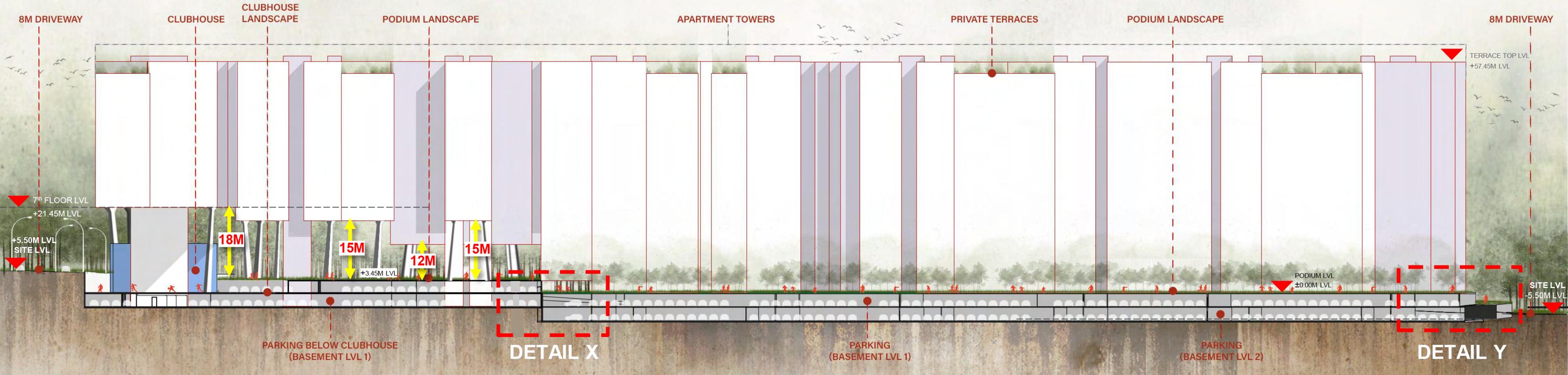 Staggered unit subtraction at the terrace and podium levels creates varied void heights, enabling diverse activities and enhancing spatial quality.
