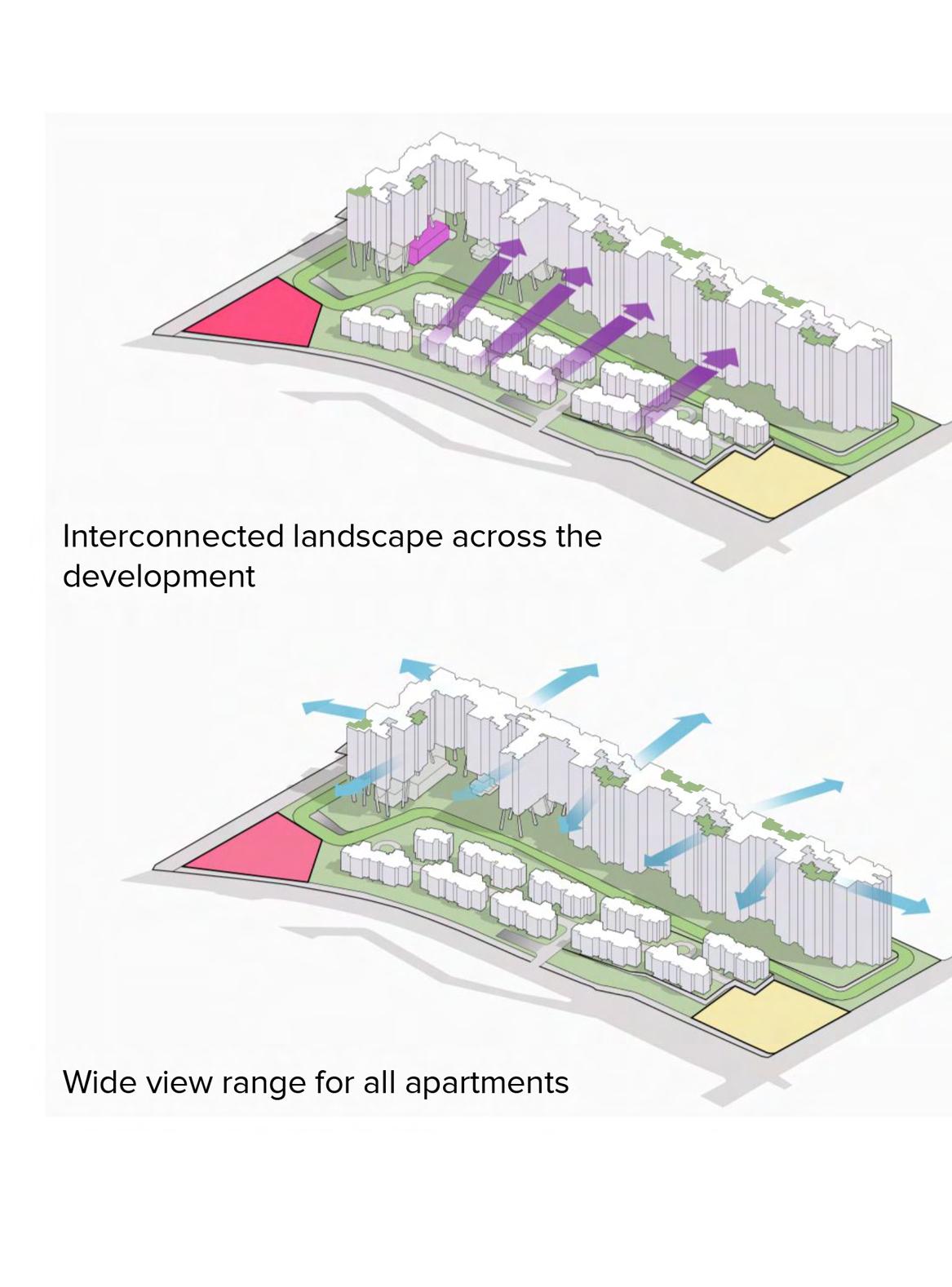 Strong visual and landscape connections are established through open sightlines, layered planting, and strategic building placement that harmonizes built form with the natural topography, ensuring an immersive and continuous green experience throughout the site.