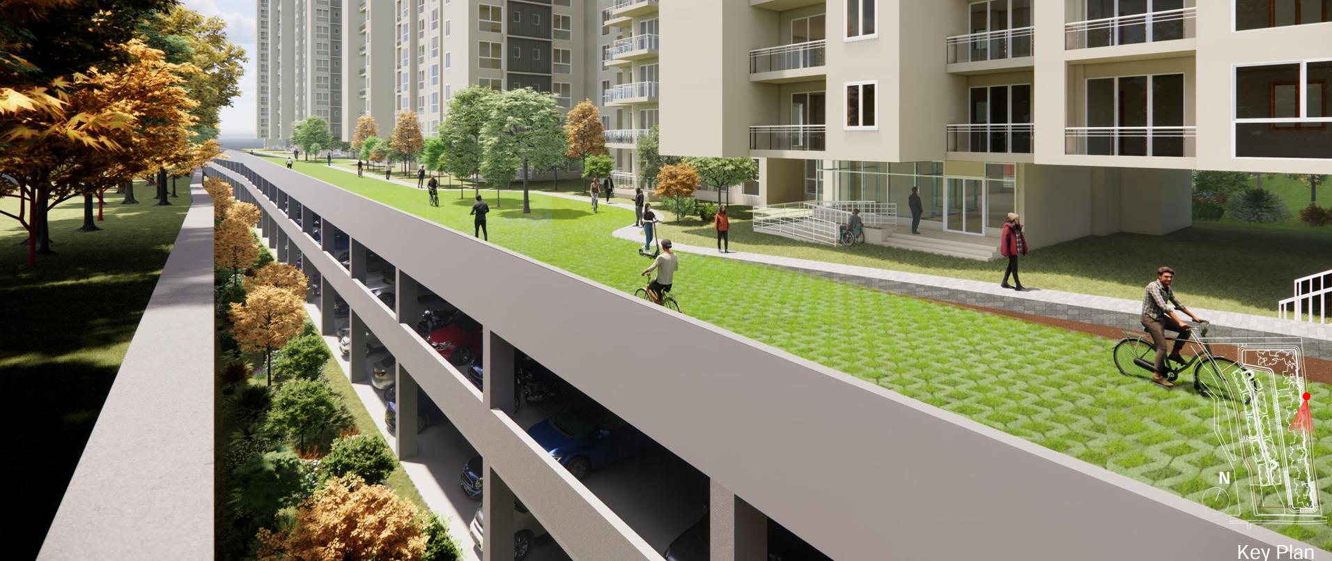 The different building typologies are strategically spaced, with clear segregation of pedestrian and vehicular circulation to enhance movement and safety. Priority is given to connectivity with the central courtyard. All buildings are designed for cross ventilation, promoting natural airflow and adequate sunlight.