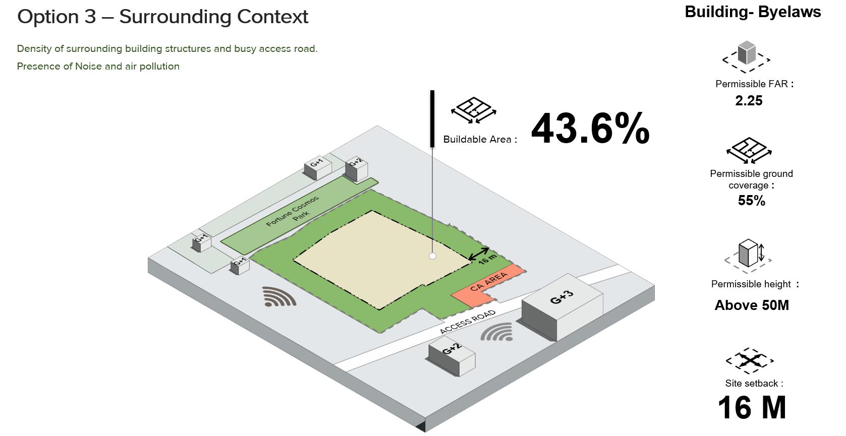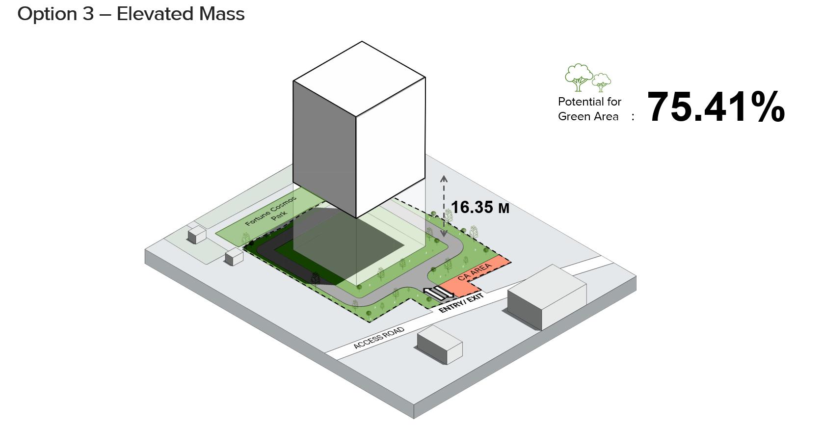 This selected 3D massing option was chosen from four presented alternatives. It achieves a green coverage of 93.36%, while successfully meeting all client requirements